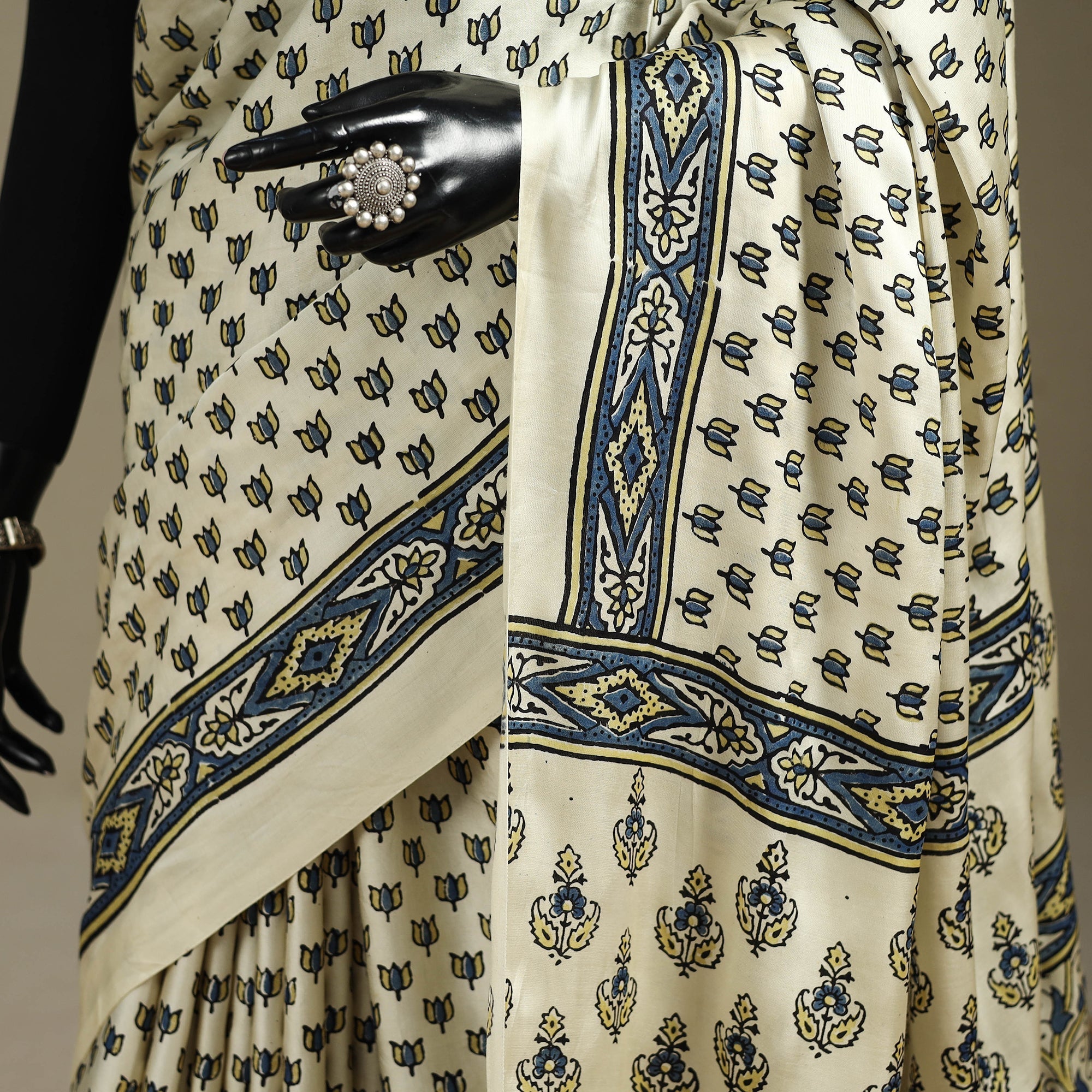 Beige hand block printed modal silk ajrakh saree reflects the traditional artistry of Kutch. Made with natural dyes using ancient resist-dyeing techniques, it features intricate geometric patterns created through multiple stages of printing and dyeing. Finished with a classic lagdi patta and tassels this saree offers a beautiful blend of elegance, comfort and cultural heritage.