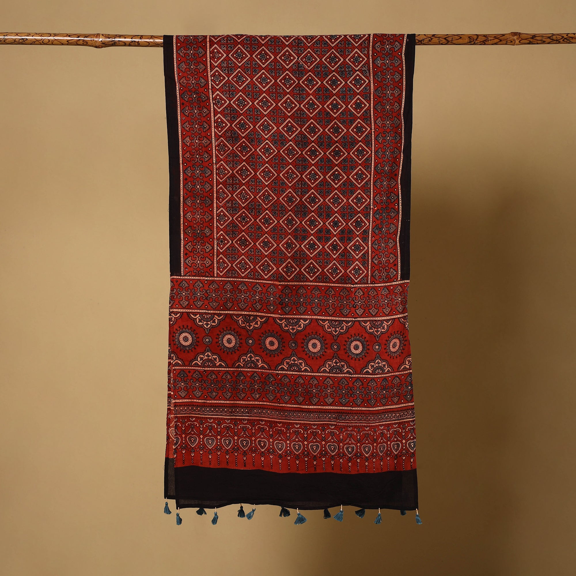 This red mul cotton ajrakh stole is crafted using natural dyes and hand block printed with traditional wooden blocks by artisan Riyaz Abdul Majid Khatri from Kutch. It features classic ajrakh patterns, delicate tassels, and a soft, breathable texture that feels gentle against the skin. Perfect for pairing with both ethnic and contemporary outfits, it brings effortless elegance to any look.