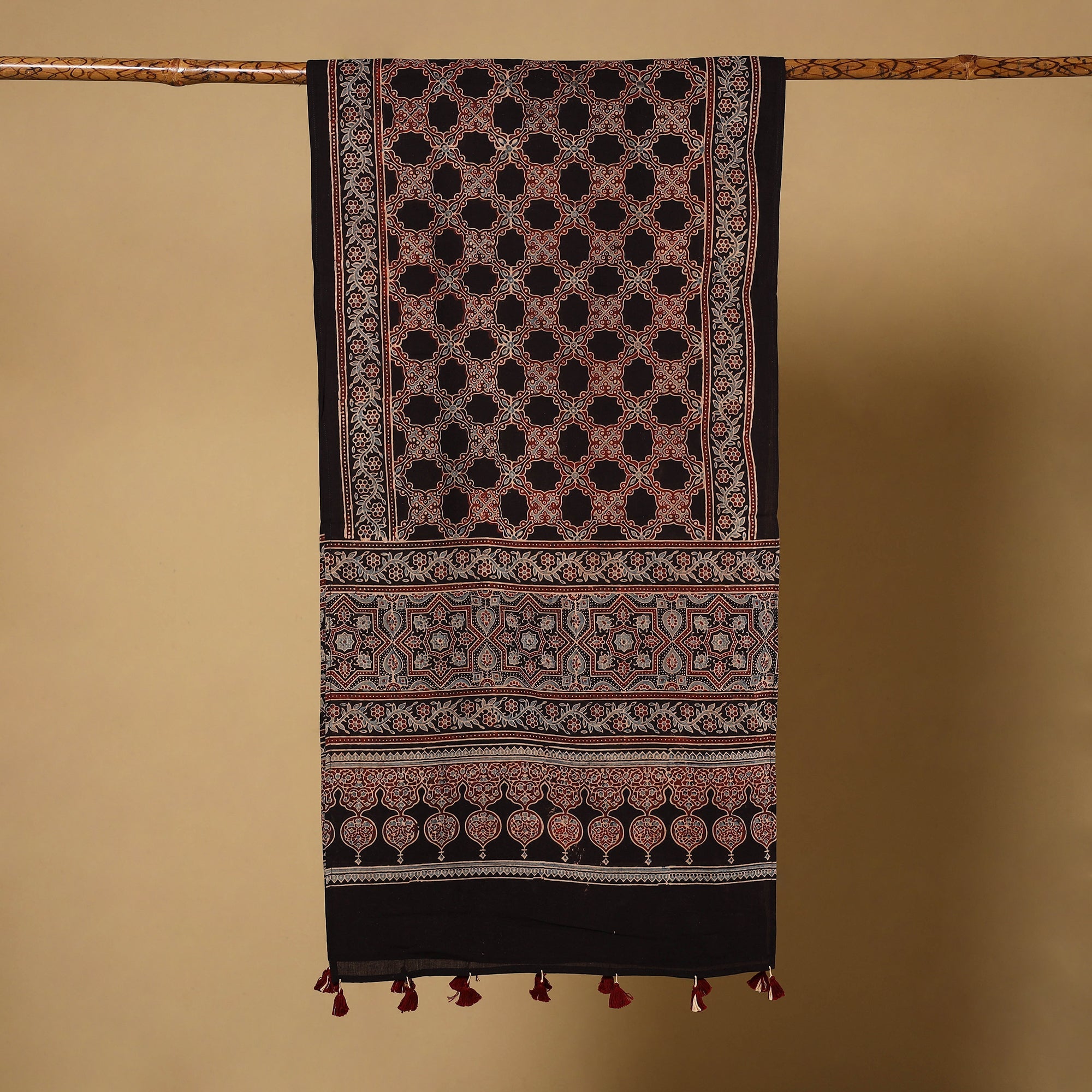 This black mul cotton ajrakh stole is crafted using natural dyes and hand block printed with traditional wooden blocks by artisan Riyaz Abdul Majid Khatri from Kutch. It features classic ajrakh patterns, delicate tassels, and a soft, breathable texture that feels gentle against the skin. Perfect for pairing with both ethnic and contemporary outfits, it brings effortless elegance to any look.