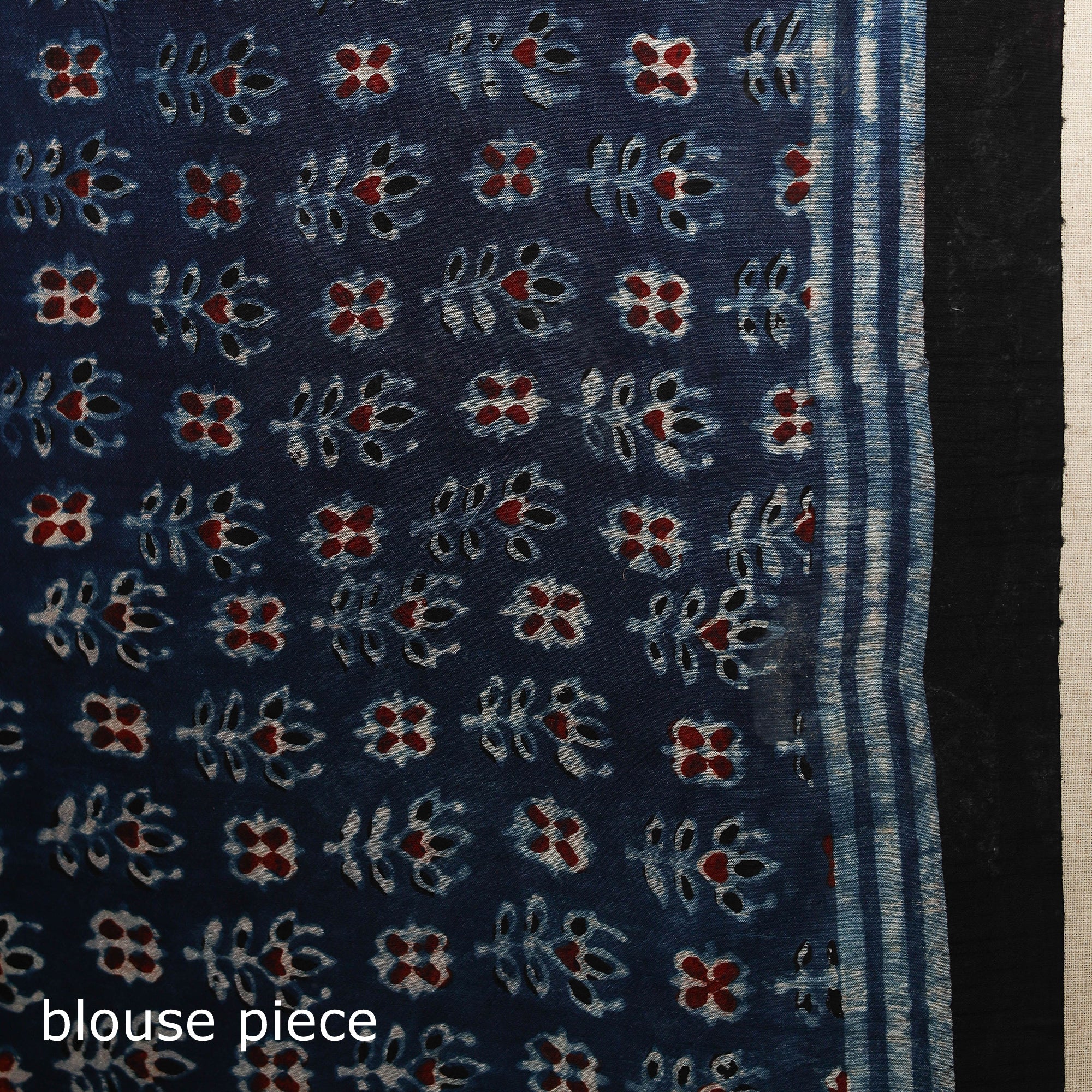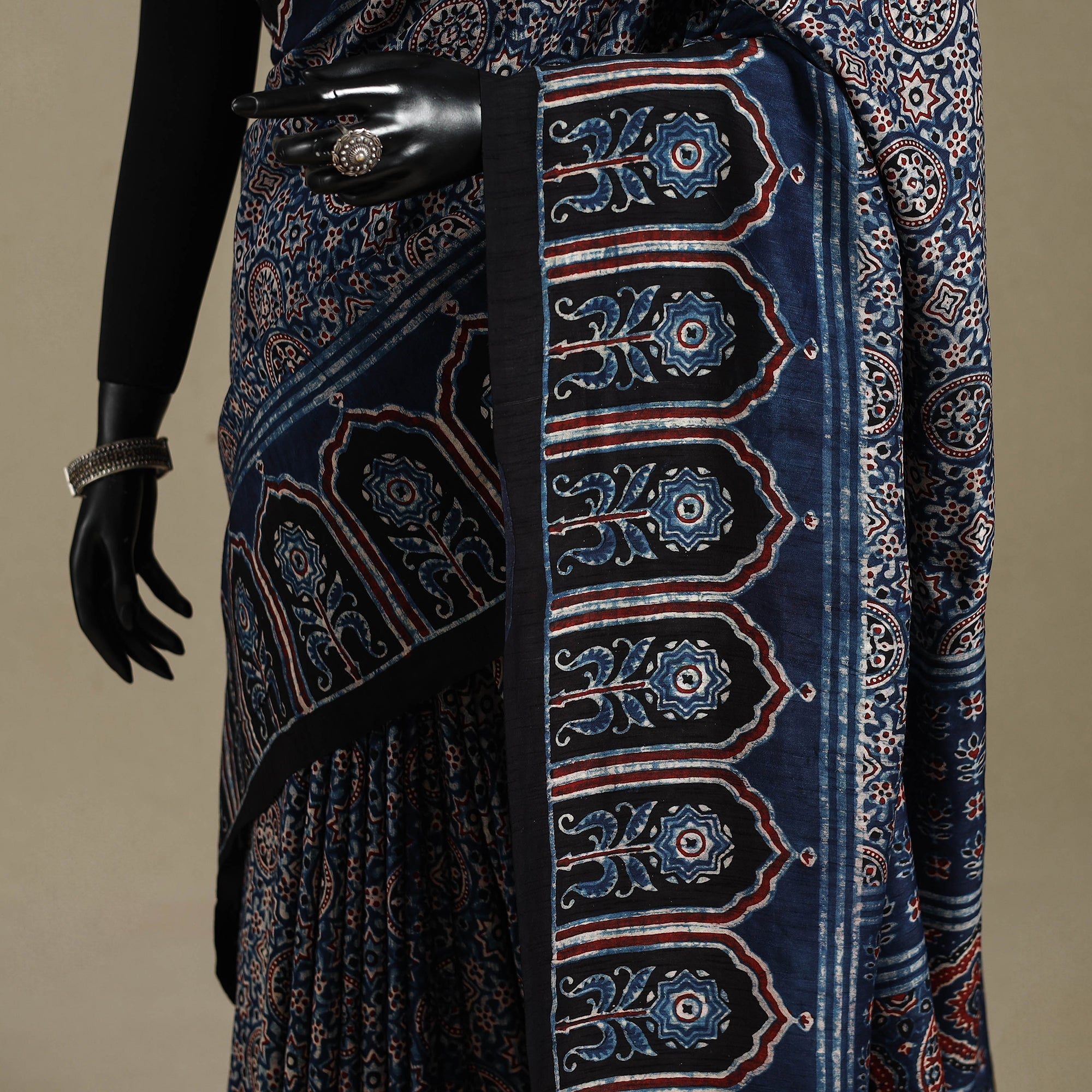 This blue naturally dyed hand block print silk ajrakh saree showcases the artistry of Kutch artisans. Made with natural dyes, the resist-dyeing tradition of ajrakh, its roots to the Indus Valley Civilization, nearly 4,500 years ago. Each saree tells a story of heritage and skill, created through multiple stages of printing and dyeing that bring out its iconic geometric motifs. Perfect for special occasions, this saree blends elegance with sustainability. Celebrate culture and artistry with every drape.