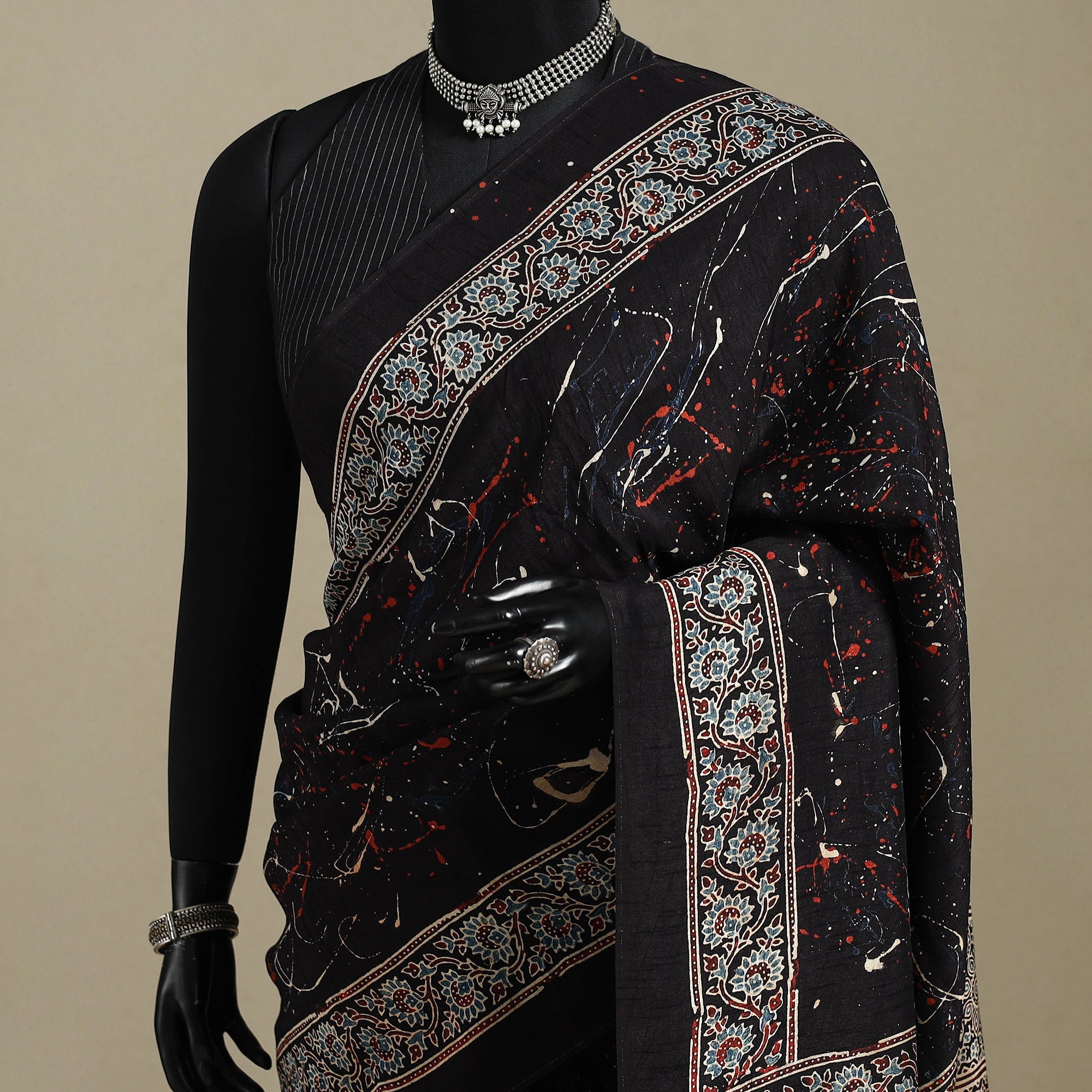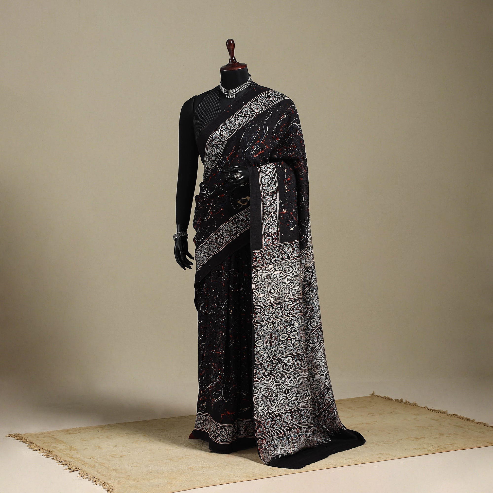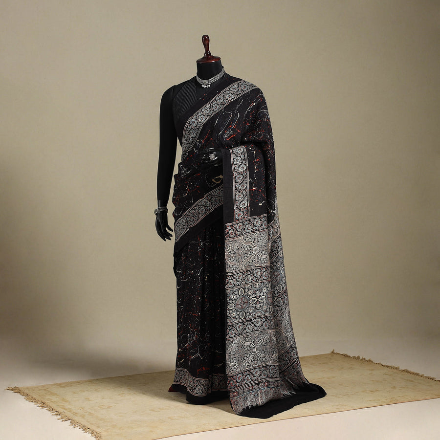 This black naturally dyed hand block print silk ajrakh saree showcases the artistry of Kutch artisans. Made with natural dyes, the resist-dyeing tradition of ajrakh, its roots to the Indus Valley Civilization, nearly 4,500 years ago. Each saree tells a story of heritage and skill, created through multiple stages of printing and dyeing that bring out its iconic geometric motifs. Perfect for special occasions, this saree blends elegance with sustainability. Celebrate culture and artistry with every drape.