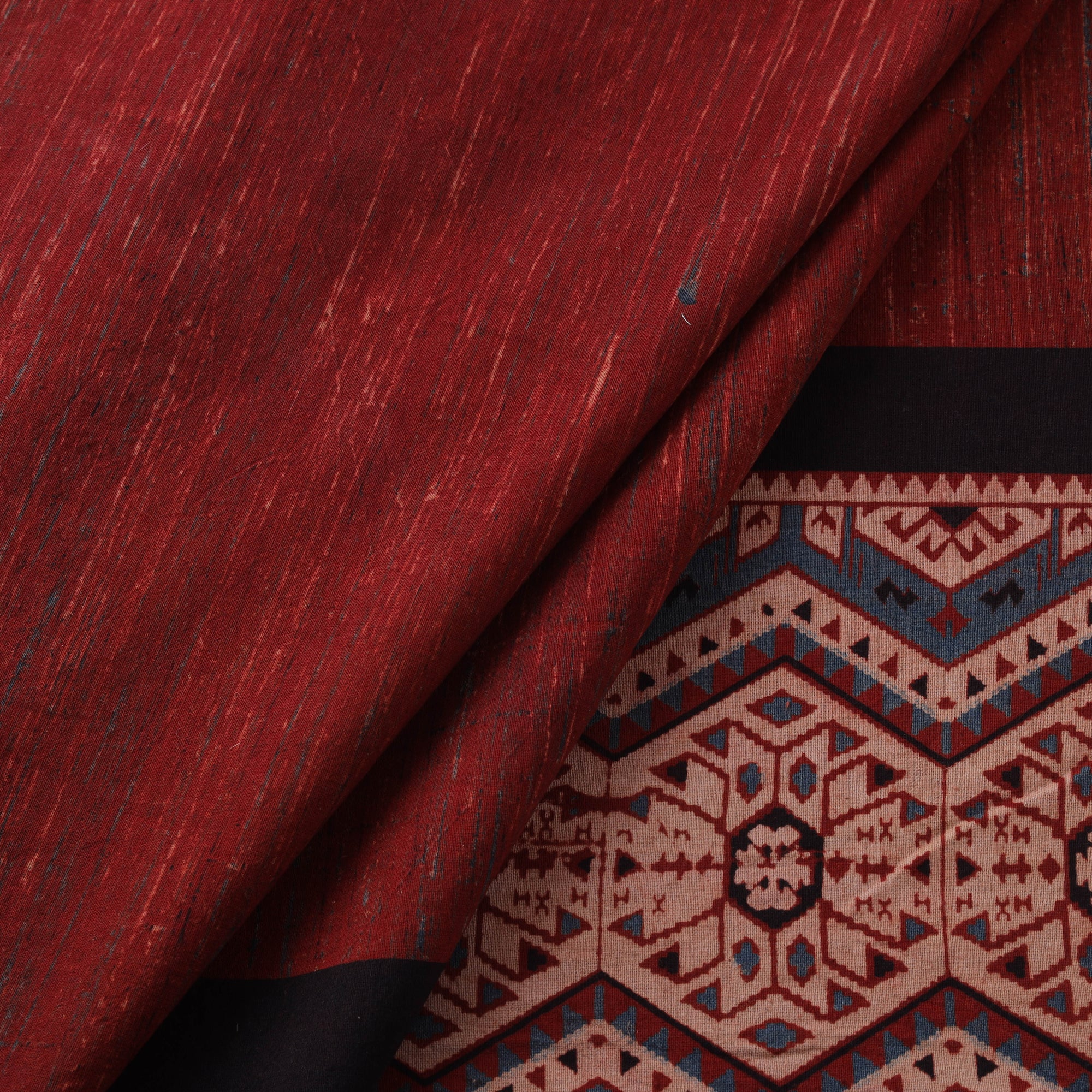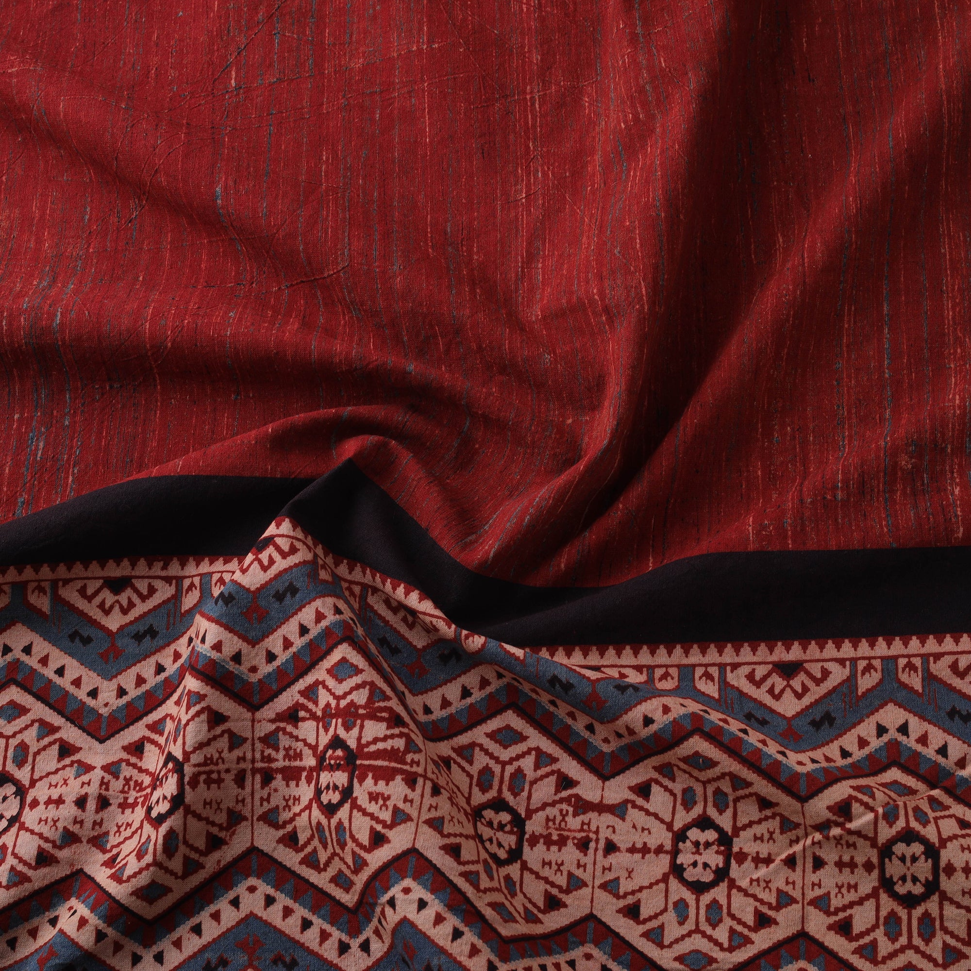 Ajrakh cotton brush print fabric from Kutch, Gujarat, is hand block printed by skilled artisans using traditional methods and natural dyes. This craft is believed to be around 4,500 years old and has its origins in Sindh, later developing in Kutch and Barmer, Rajasthan. Ajrakh has traditionally been worn by the Maldhari community of Bhuj. The fabric is made through a detailed, multi-step dyeing process that helps achieve deep, lasting colours. With a soft brush-style texture and ajrakh patterns, this breathable cotton fabric is suitable for kurtas, dresses, shirts and home decor.