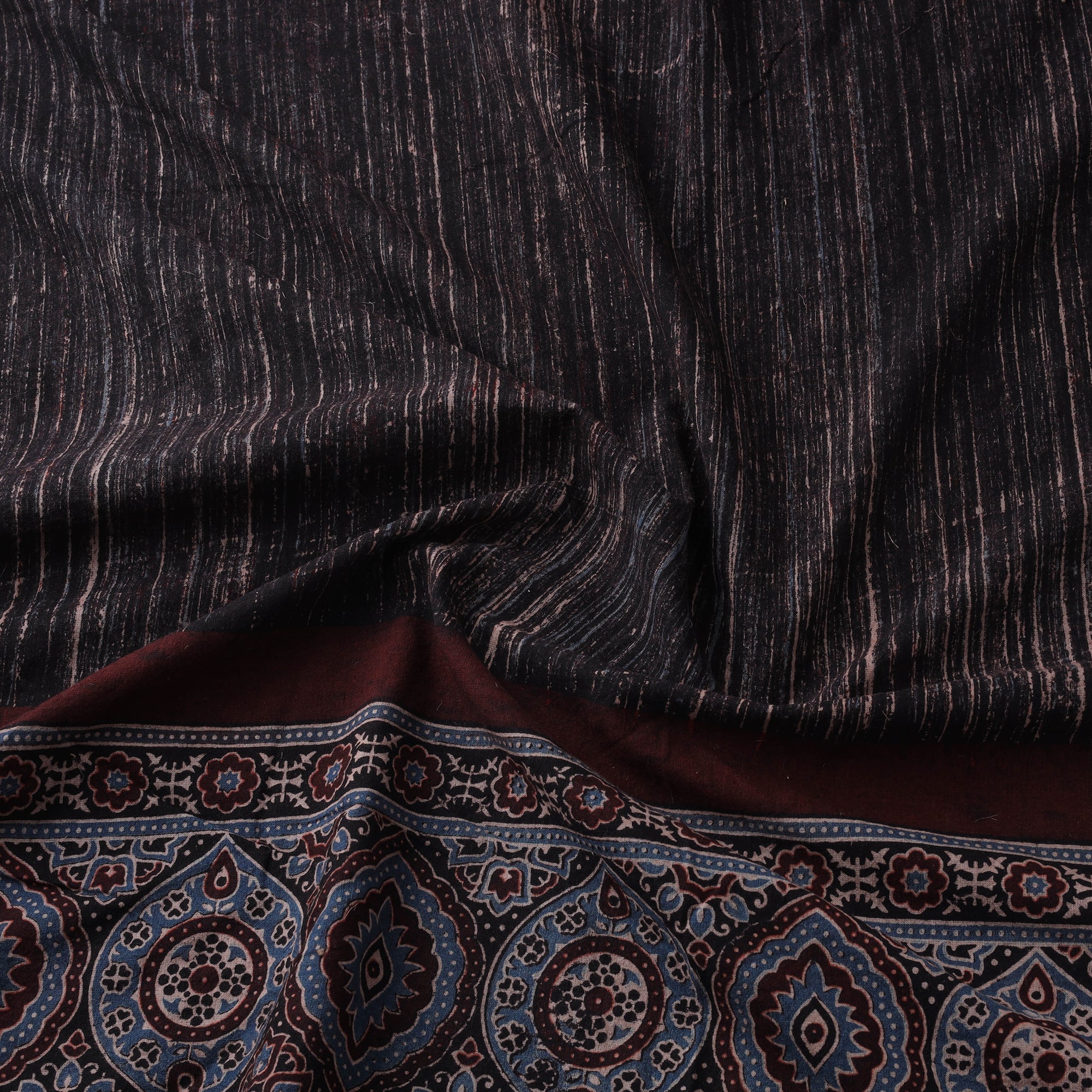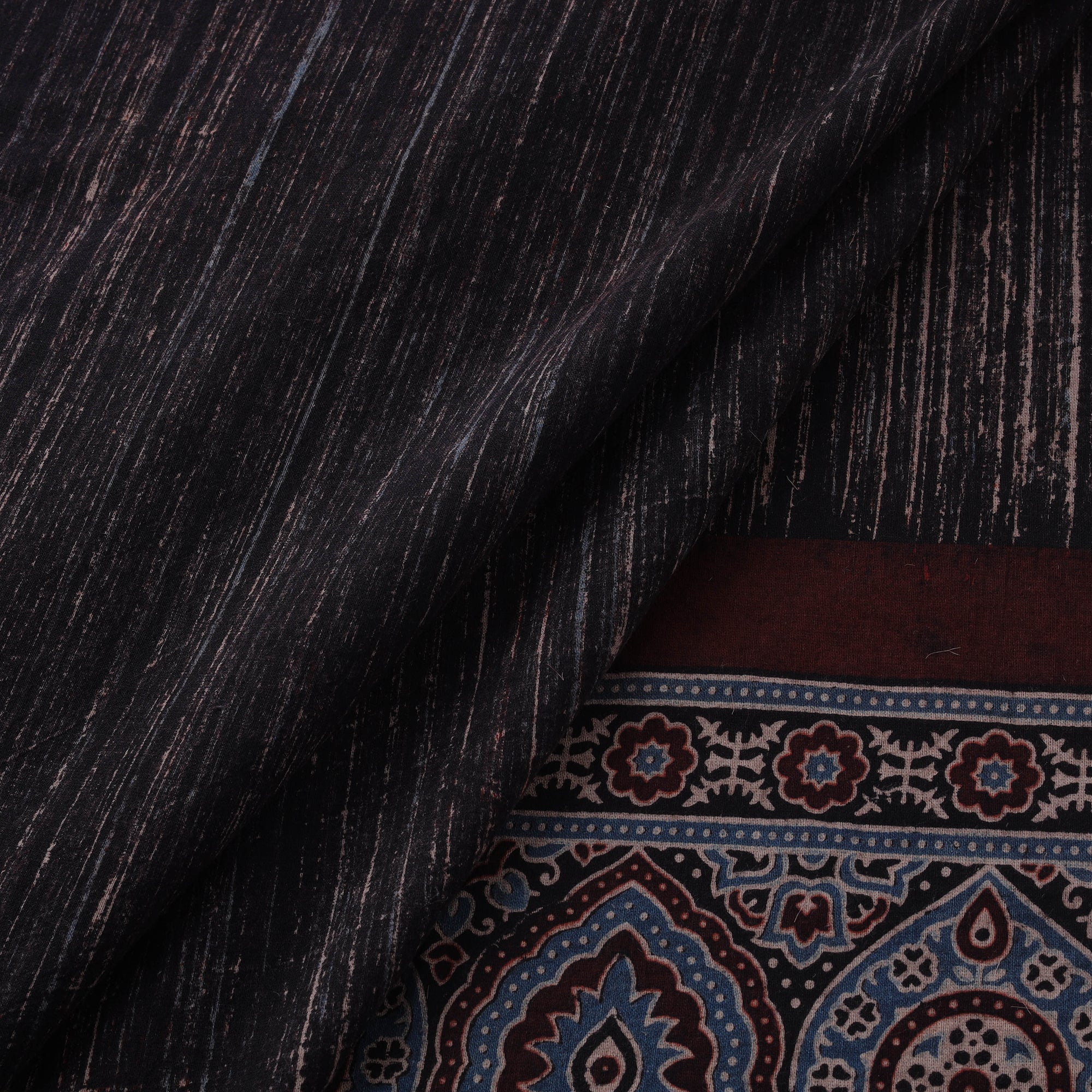 Black ajrakh cotton brush print fabric from Kutch, Gujarat, is hand block printed by skilled artisans using traditional methods and natural dyes. This craft is believed to be around 4,500 years old and has its origins in Sindh, later developing in Kutch and Barmer, Rajasthan. Ajrakh has traditionally been worn by the Maldhari community of Bhuj. The fabric is made through a detailed, multi-step dyeing process that helps achieve deep, lasting colours. With a soft brush-style texture and ajrakh patterns, this breathable cotton fabric is suitable for kurtas, dresses, shirts and home decor.