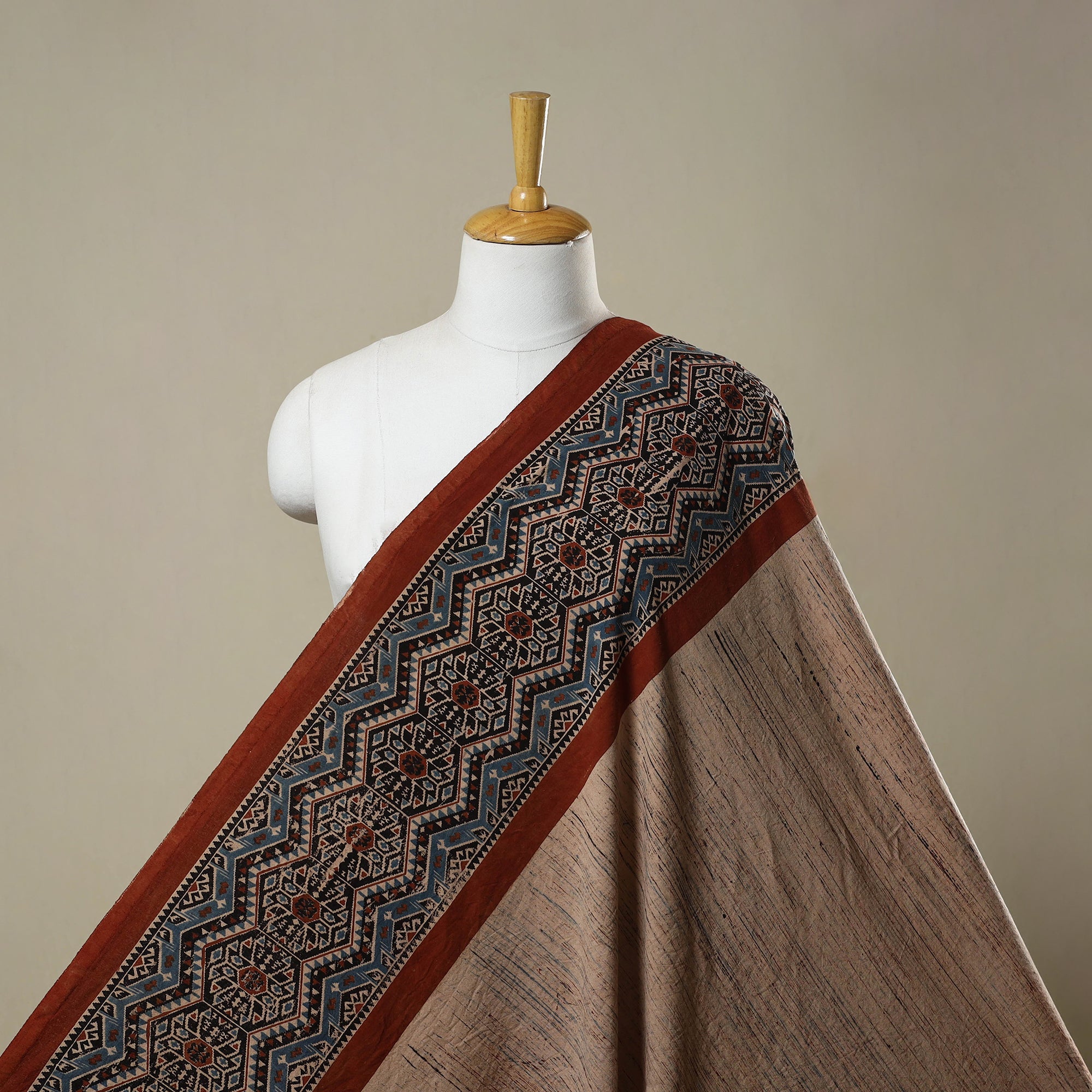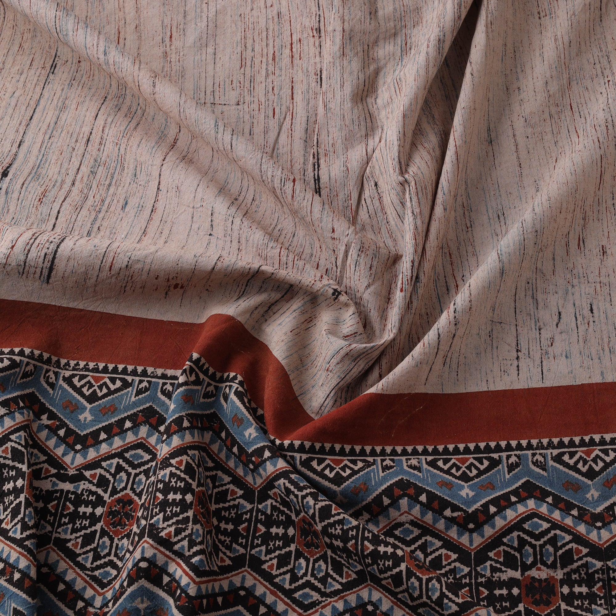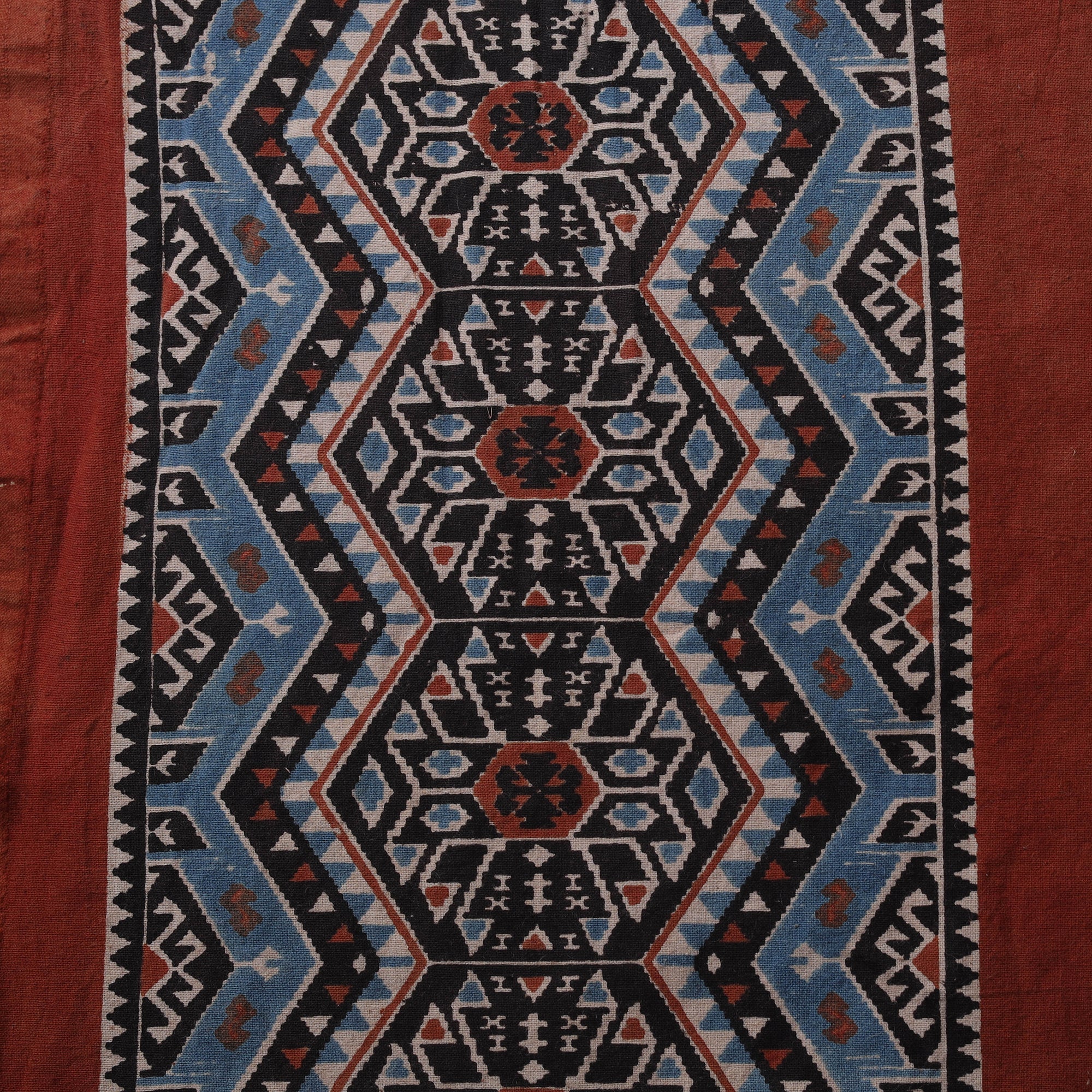 Ajrakh cotton brush print fabric from Kutch, Gujarat, is hand block printed by skilled artisans using traditional methods and natural dyes. This craft is believed to be around 4,500 years old and has its origins in Sindh, later developing in Kutch and Barmer, Rajasthan. Ajrakh has traditionally been worn by the Maldhari community of Bhuj. The fabric is made through a detailed, multi-step dyeing process that helps achieve deep, lasting colours. With a soft brush-style texture and ajrakh patterns, this breathable cotton fabric is suitable for kurtas, dresses, shirts and home decor.