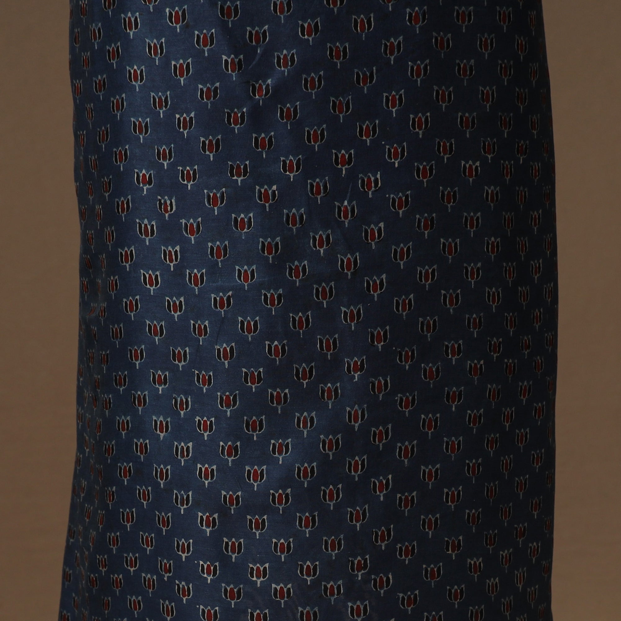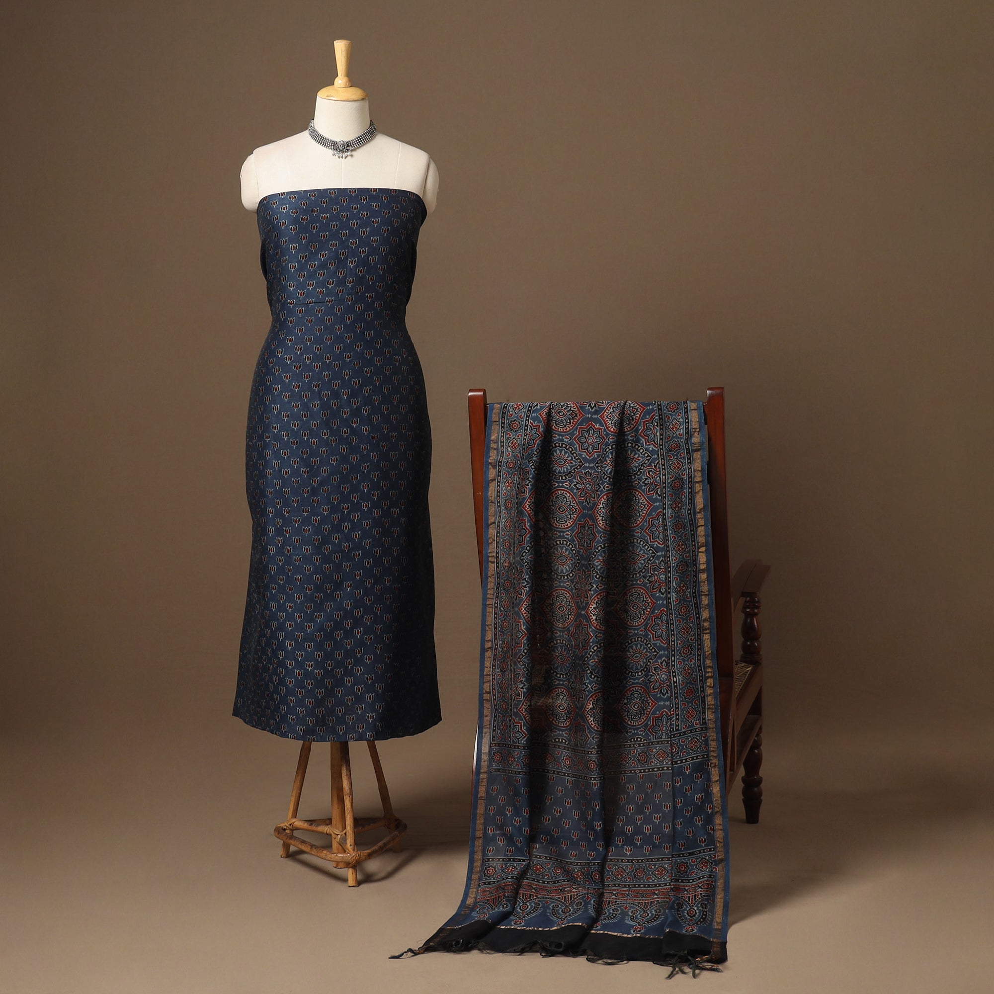 Elevate your wardrobe with this blue 2pc chanderi silk-cotton ajrakh dress material, block-printed by skilled artisans of Kutch, Gujarat. Featuring natural dyes and intricate geometric patterns, ajrakh is a centuries-old craft rooted in India’s textile legacy. This set includes kurta fabric and a beautifully printed dupatta. Easy to stitch, breathable, and ideal for year-round wear.