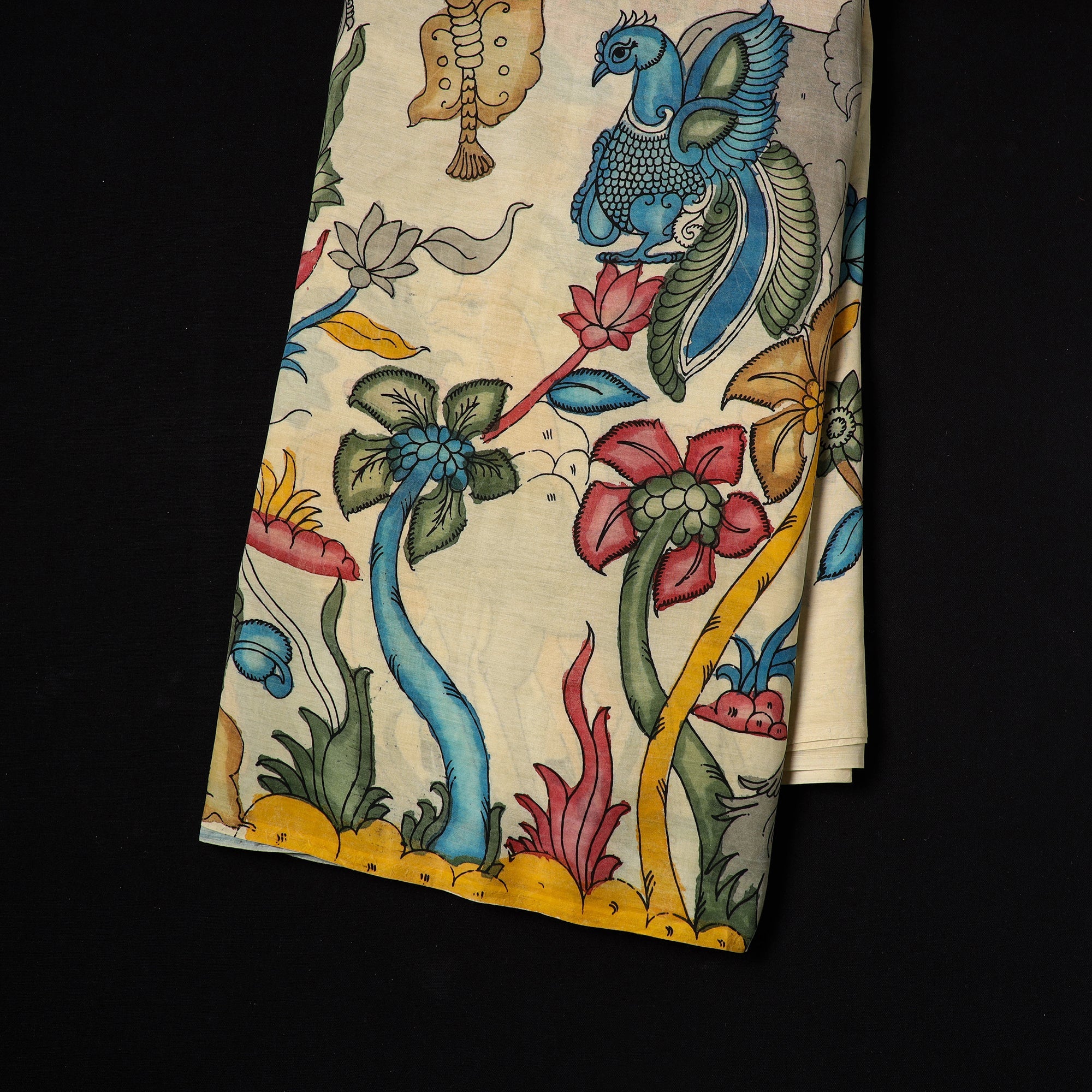 This beige chanderi silk-cotton hand-painted srikalahasti pen kalamkari fabric is a true reflection of India’s rich artisanal heritage. Created using natural colors, the srikalahasti style features intricate freehand drawings with a kalam (pen), a skill passed down through generations of master artisans. Each piece is one-of-a-kind, showcasing fine detailing and the legacy of this centuries-old art form. Ideal for designing clothing, festive wear, or unique décor accents. The Kalamkari craft lends a distinct odor to the product.