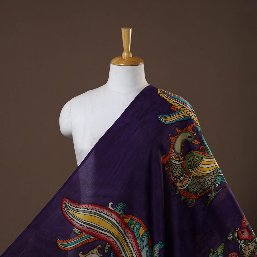This purple chanderi silk-cotton hand-painted srikalahasti pen kalamkari fabric is a true reflection of India’s rich artisanal heritage. Created using natural colors, the srikalahasti style features intricate freehand drawings with a kalam (pen), a skill passed down through generations of master artisans. Each piece is one-of-a-kind, showcasing fine detailing and the legacy of this centuries-old art form. Ideal for designing clothing, festive wear, or unique décor accents. The Kalamkari craft lends a distinct odor to the product.