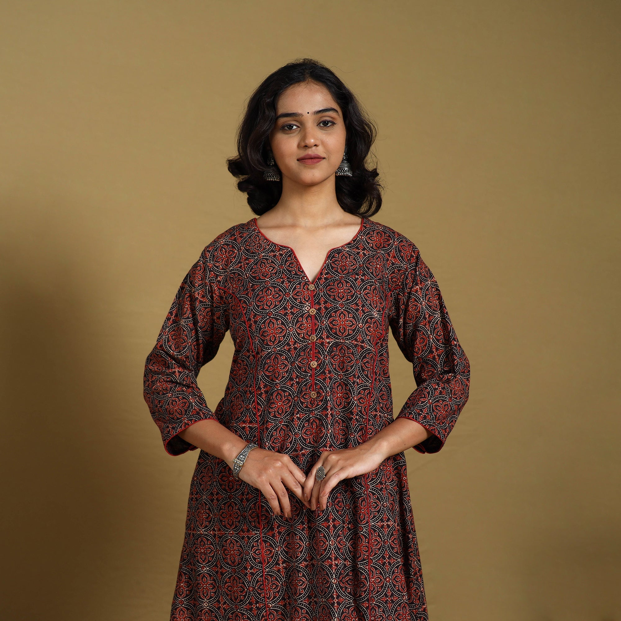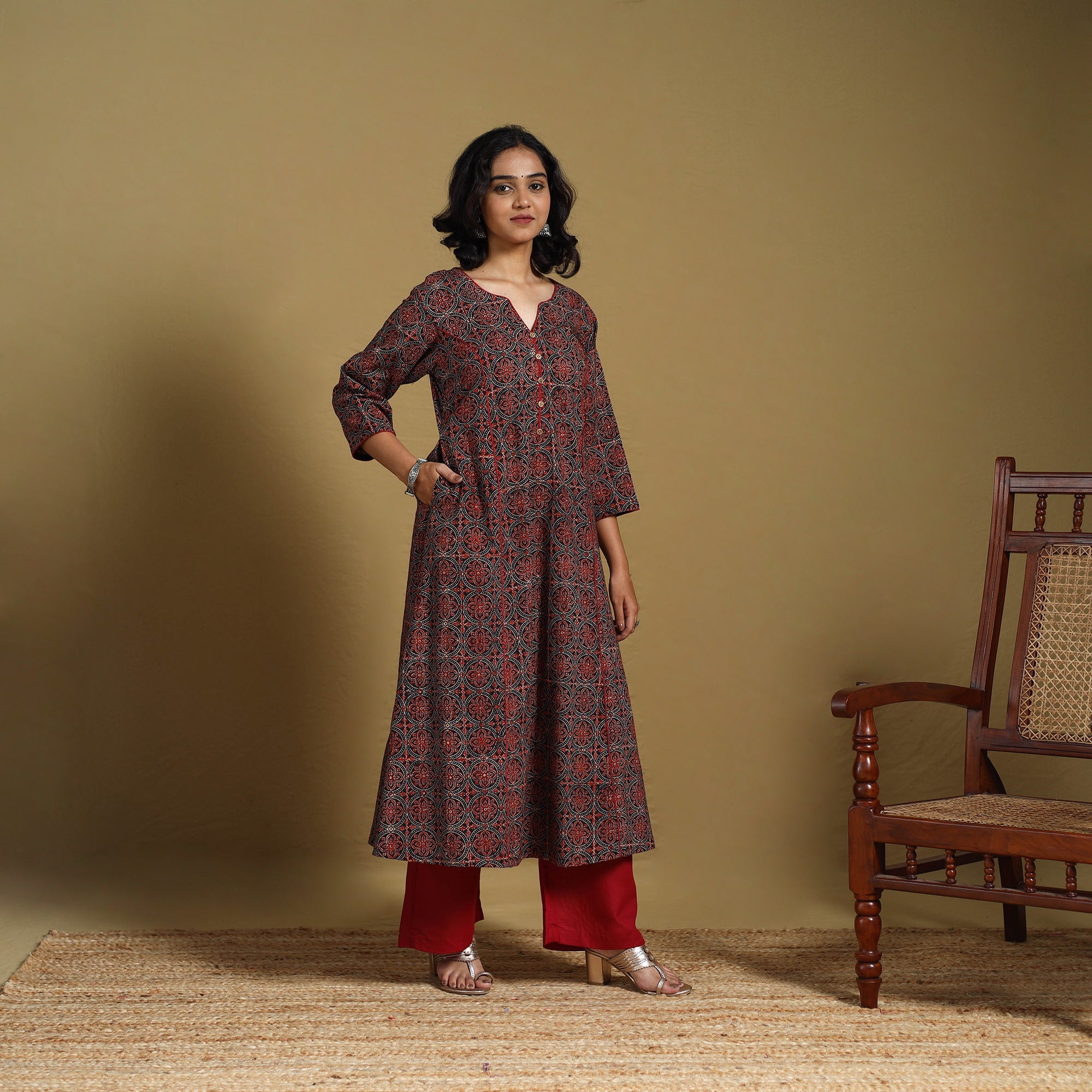 Look and feel beautiful in this red a-line ajrakh kurta. Crafted from naturally dyed fabric using the traditional ajrakh block printing method, it blends timeless design with everyday comfort. The breathable cotton fabric offers all-day ease, while a functional side pocket adds practicality, perfect for casual outings or festive gatherings.