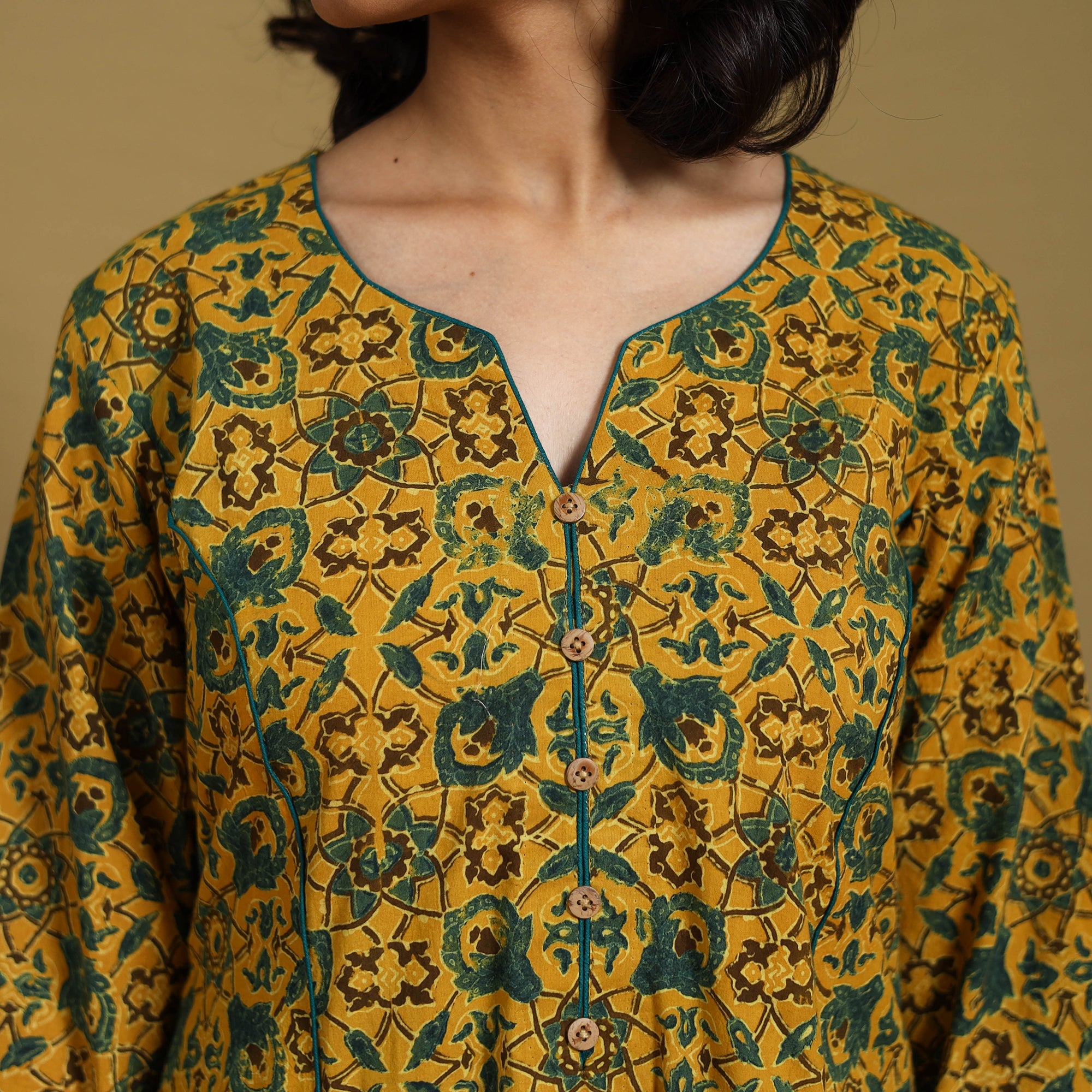 Look and feel beautiful in this yellow a-line ajrakh kurta. Crafted from naturally dyed fabric using the traditional ajrakh block printing method, it blends timeless design with everyday comfort. The breathable cotton fabric offers all-day ease, while a functional side pocket adds practicality, perfect for casual outings or festive gatherings.