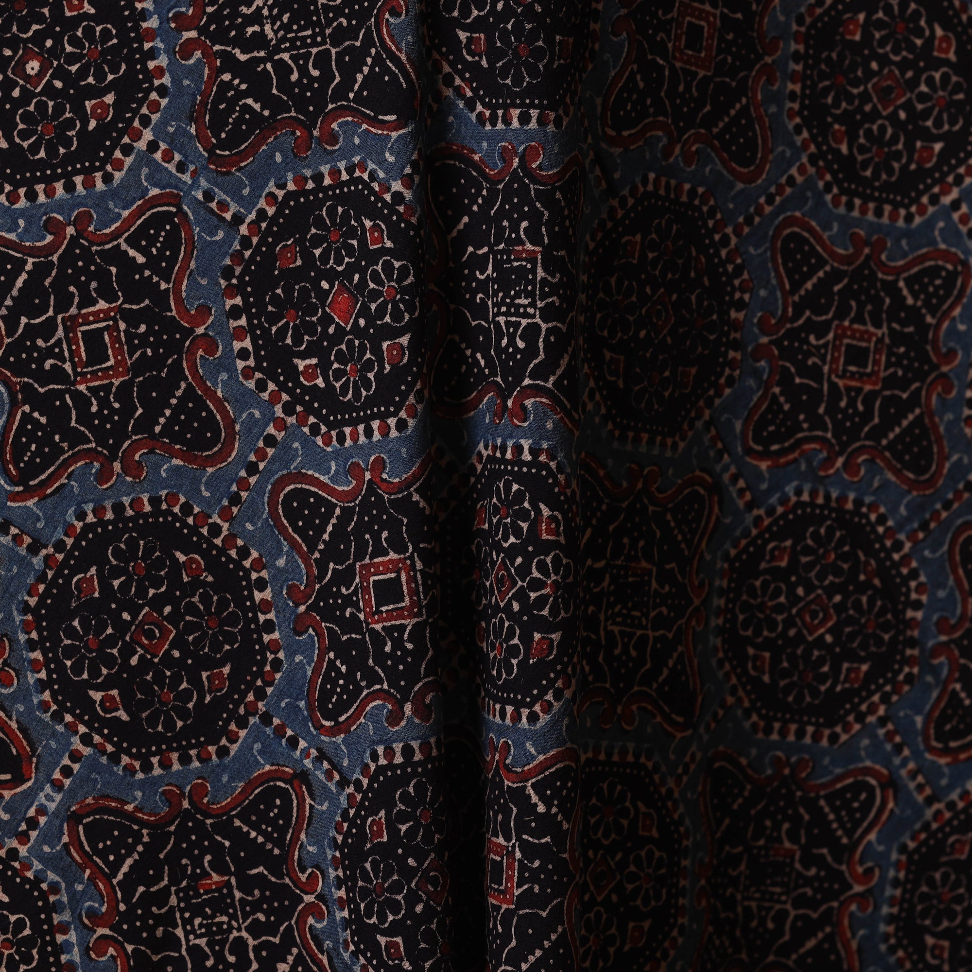 This black block-print cotton ajrakh fabric is meticulously crafted by expert artisan Jabbar Khatri in Gujarat’s Kutch region. Made using natural dyes, this eco-friendly fabric is perfect for custom outfits, upholstery, and creative projects, seamlessly blending cultural heritage with sustainability.