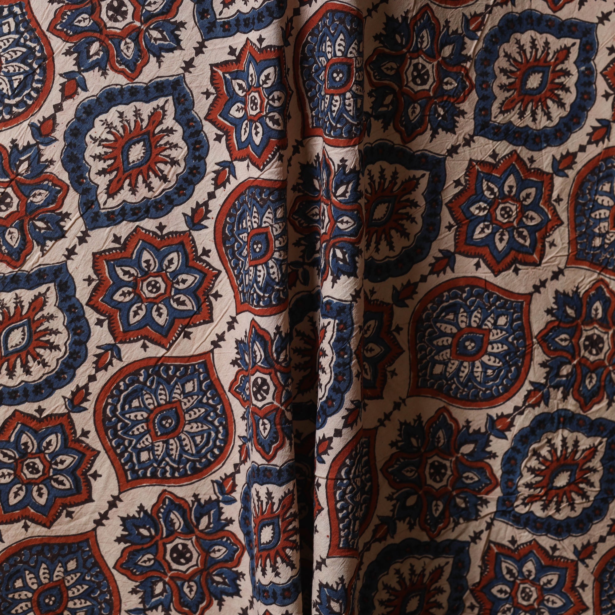 This beige block-print cotton ajrakh fabric is meticulously crafted by expert artisan Jabbar Khatri in Gujarat’s Kutch region. Made using natural dyes, this eco-friendly fabric is perfect for custom outfits, upholstery, and creative projects, seamlessly blending cultural heritage with sustainability.
