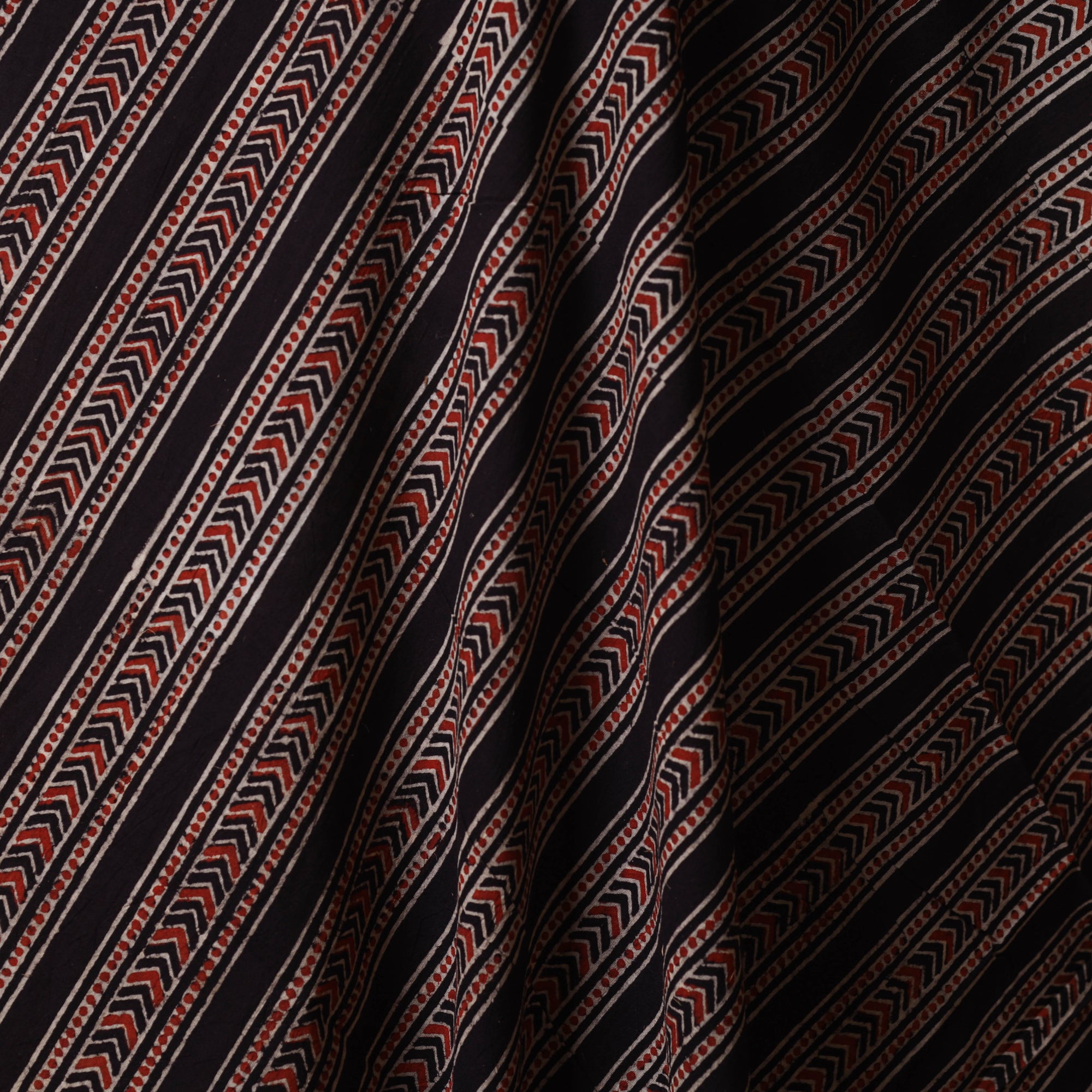 This black block-print cotton ajrakh fabric is meticulously crafted by expert artisan Jabbar Khatri in Gujarat’s Kutch region. Made using natural dyes, this eco-friendly fabric is perfect for custom outfits, upholstery, and creative projects, seamlessly blending cultural heritage with sustainability.