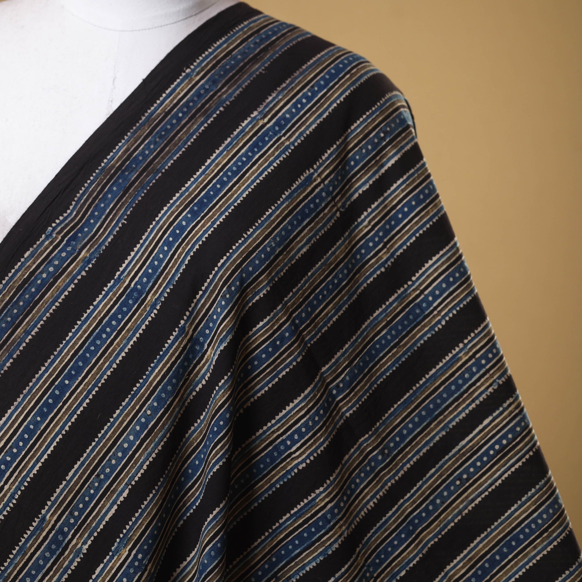 This black block-print cotton ajrakh fabric is meticulously crafted by expert artisan Jabbar Khatri in Gujarat’s Kutch region. Made using natural dyes, this eco-friendly fabric is perfect for custom outfits, upholstery, and creative projects, seamlessly blending cultural heritage with sustainability.