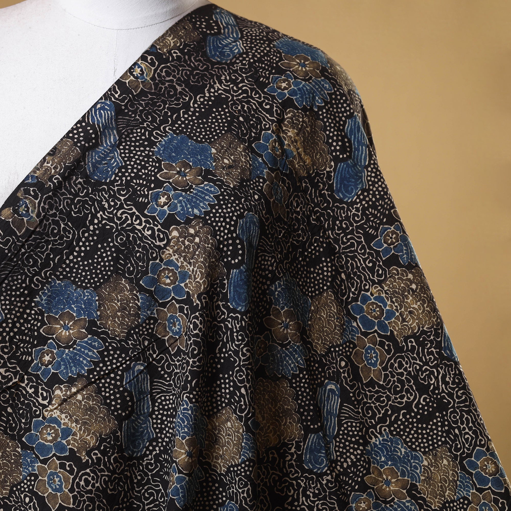 This black block-print cotton ajrakh fabric is meticulously crafted by expert artisan Jabbar Khatri in Gujarat’s Kutch region. Made using natural dyes, this eco-friendly fabric is perfect for custom outfits, upholstery, and creative projects, seamlessly blending cultural heritage with sustainability.