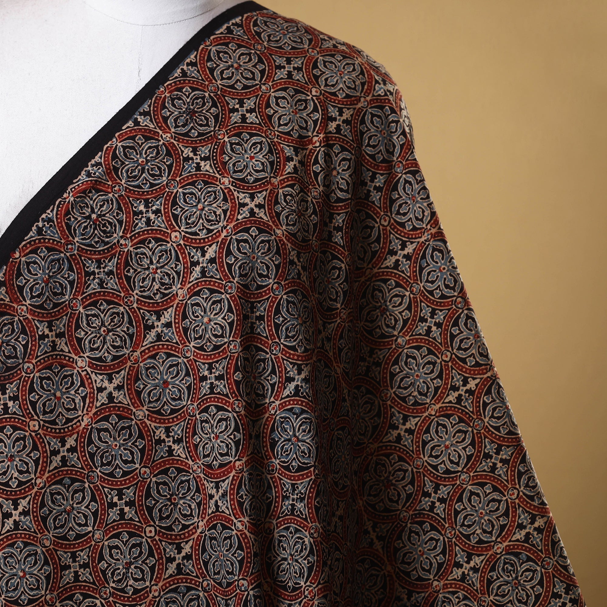 Ajrakh is a well-known traditional vegetable dyeing that resists block-printing techniques on cloth. Originated in Kutch, It is nearly around 4,500 years old practised by Khatri community of Kutch and Sikh.
