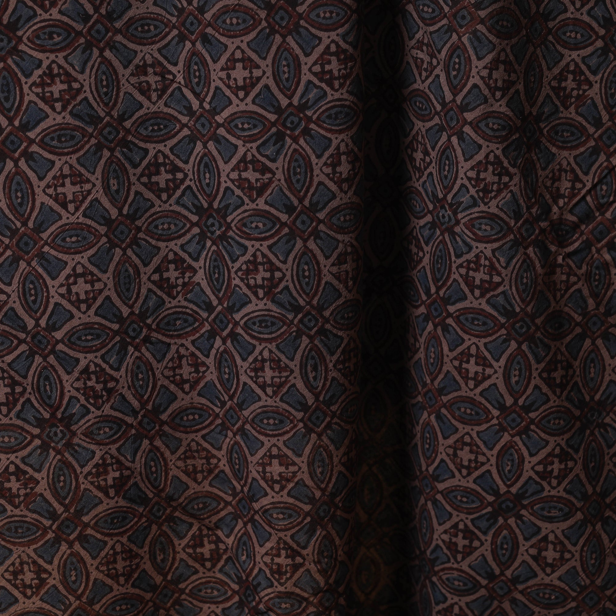 This brown block-print cotton ajrakh fabric is meticulously crafted by expert artisan Jabbar Khatri in Gujarat’s Kutch region. Made using natural dyes, this eco-friendly fabric is perfect for custom outfits, upholstery, and creative projects, seamlessly blending cultural heritage with sustainability.