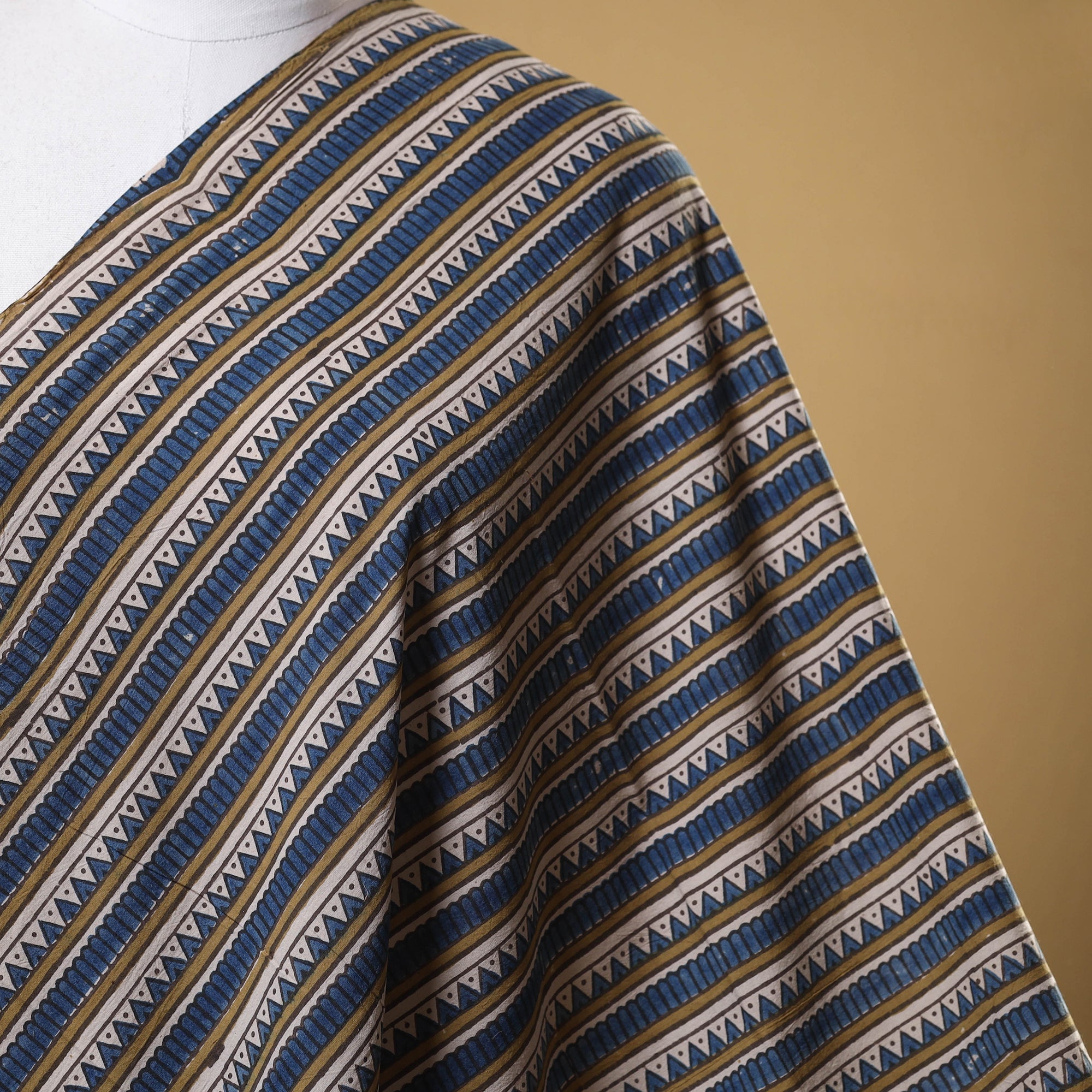 This blue block-print cotton ajrakh fabric is meticulously crafted by expert artisan Jabbar Khatri in Gujarat’s Kutch region. Made using natural dyes, this eco-friendly fabric is perfect for custom outfits, upholstery, and creative projects, seamlessly blending cultural heritage with sustainability.