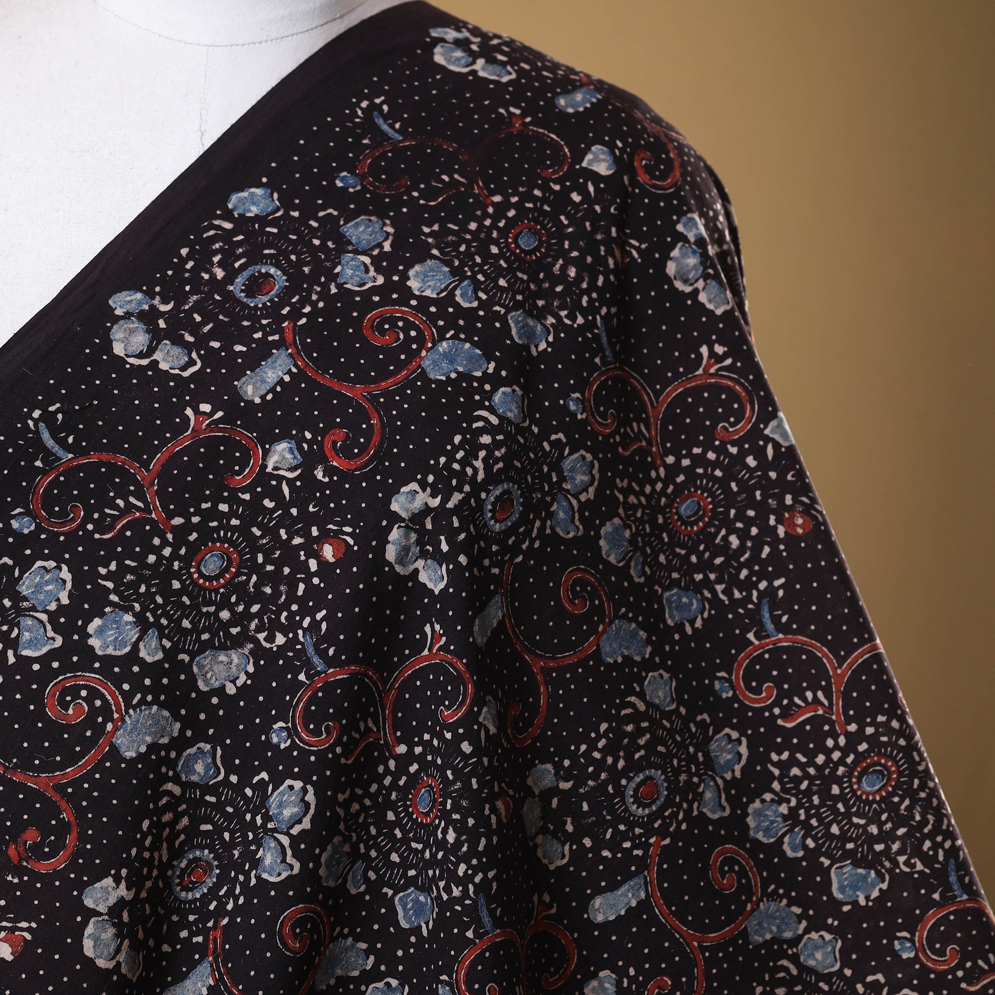 This black block-print cotton ajrakh fabric is meticulously crafted by expert artisan Jabbar Khatri in Gujarat’s Kutch region. Made using natural dyes, this eco-friendly fabric is perfect for custom outfits, upholstery, and creative projects, seamlessly blending cultural heritage with sustainability.