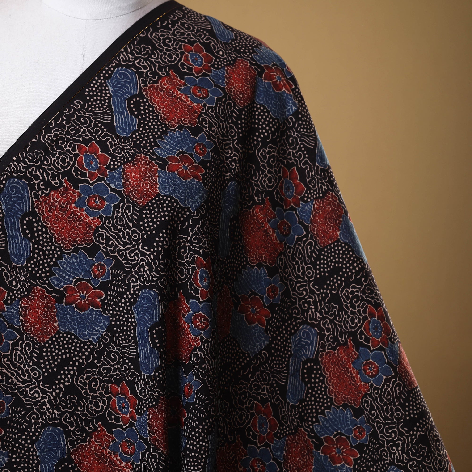 This black block-print cotton ajrakh fabric is meticulously crafted by expert artisan Jabbar Khatri in Gujarat’s Kutch region. Made using natural dyes, this eco-friendly fabric is perfect for custom outfits, upholstery, and creative projects, seamlessly blending cultural heritage with sustainability.