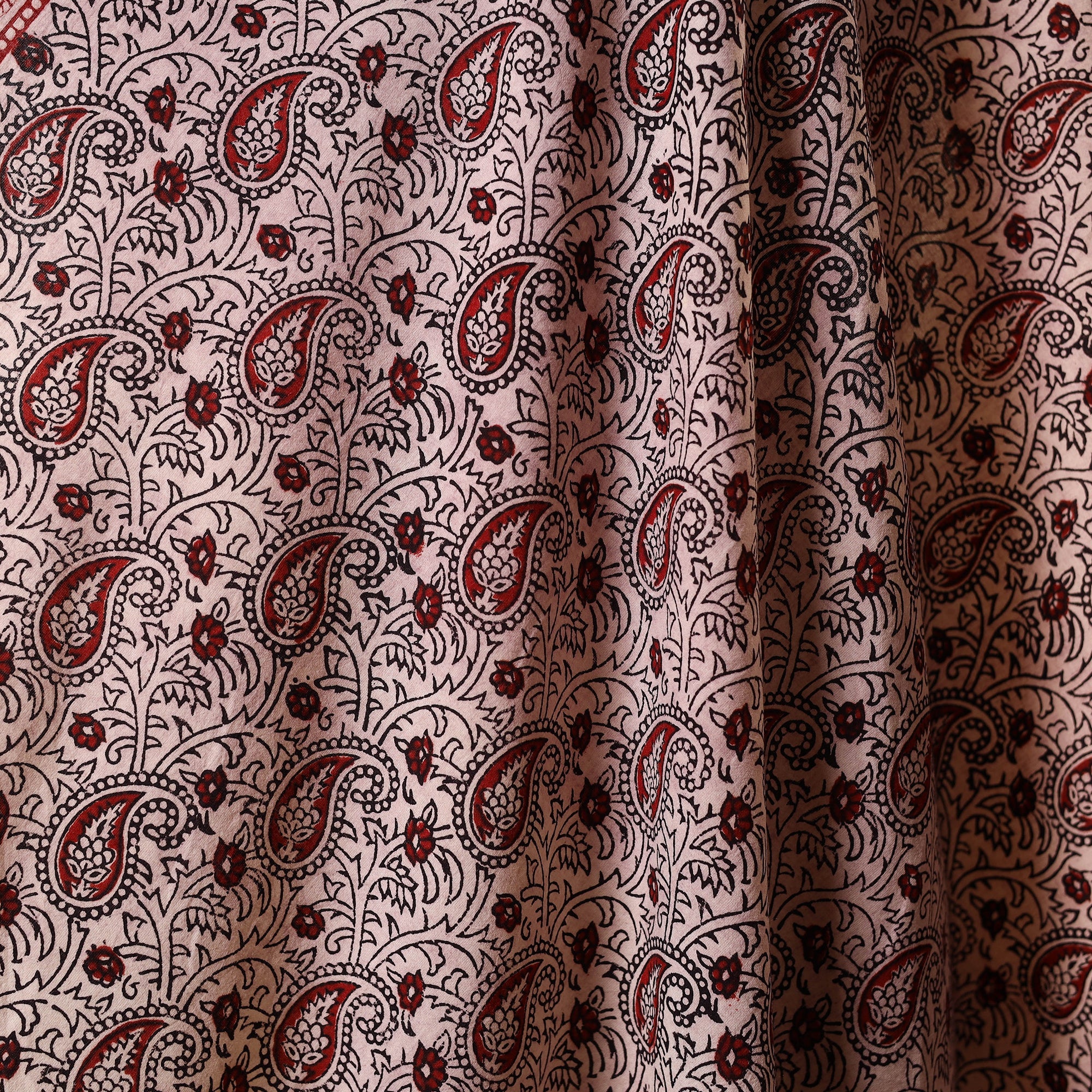 Bagh layouts are dramatic with the use of black and red alternately on a white background. Its production process is manually painstaking. Though the techniques and designs are age-old the prints retain their contemporary appeal.