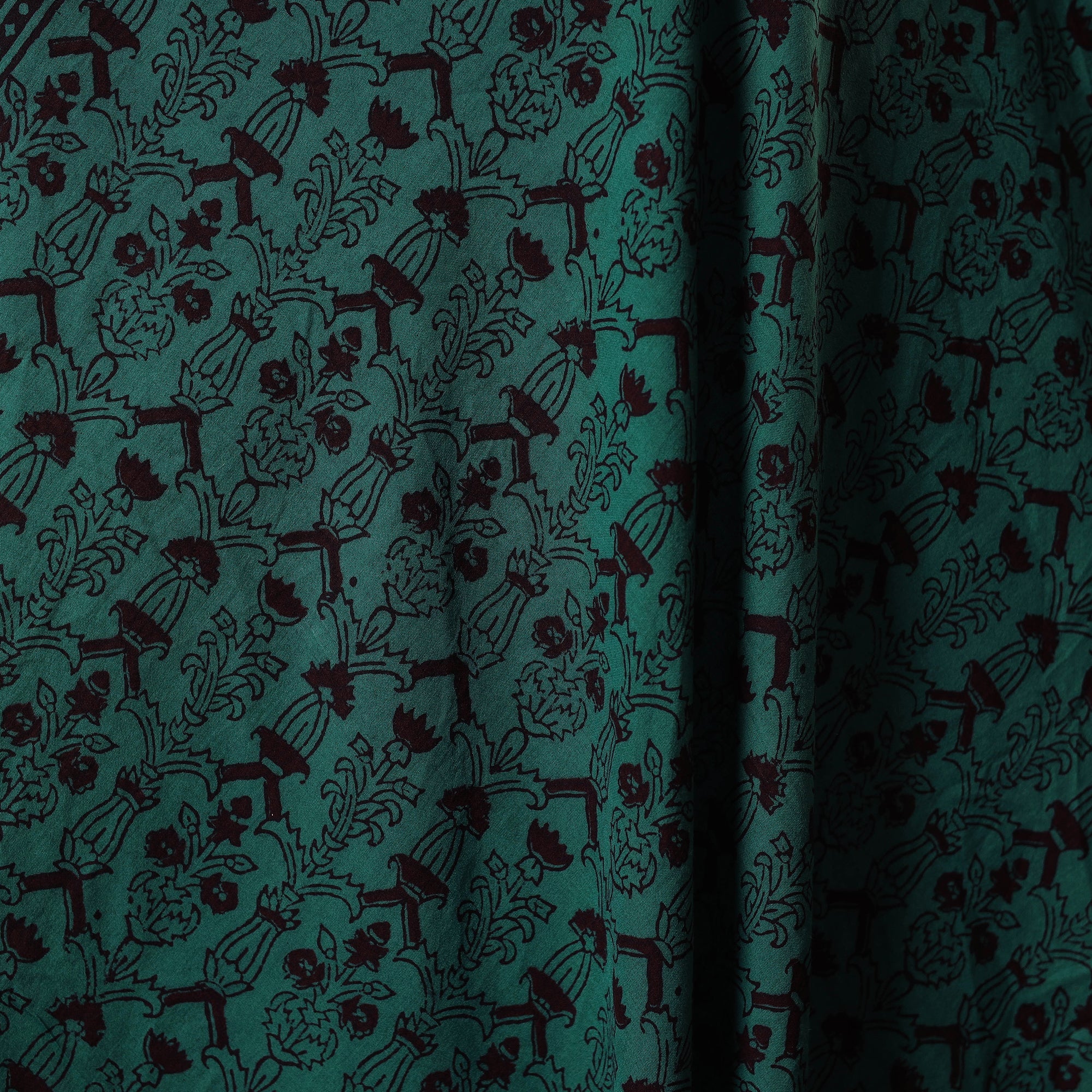 This green bagh print fabric is hand block printed by master artisan Umar Faruk Khatri from Bagh, Madhya Pradesh. It is crafted using natural dyes and traditional techniques, making it ideal for garments, accessories, or home decor. This piece beautifully blends heritage with everyday usability.