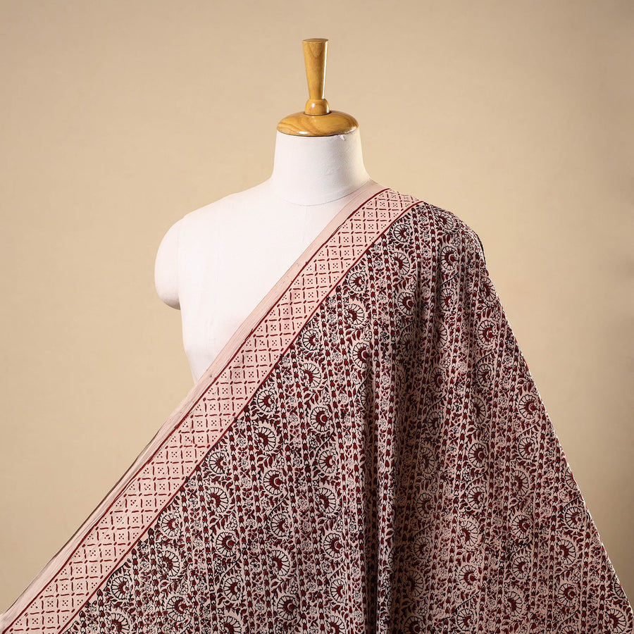 This beige bagh print fabric is hand block printed by master artisan Umar Faruk Khatri from Bagh, Madhya Pradesh. It is crafted using natural dyes and traditional techniques, making it ideal for garments, accessories, or home decor. This piece beautifully blends heritage with everyday usability.