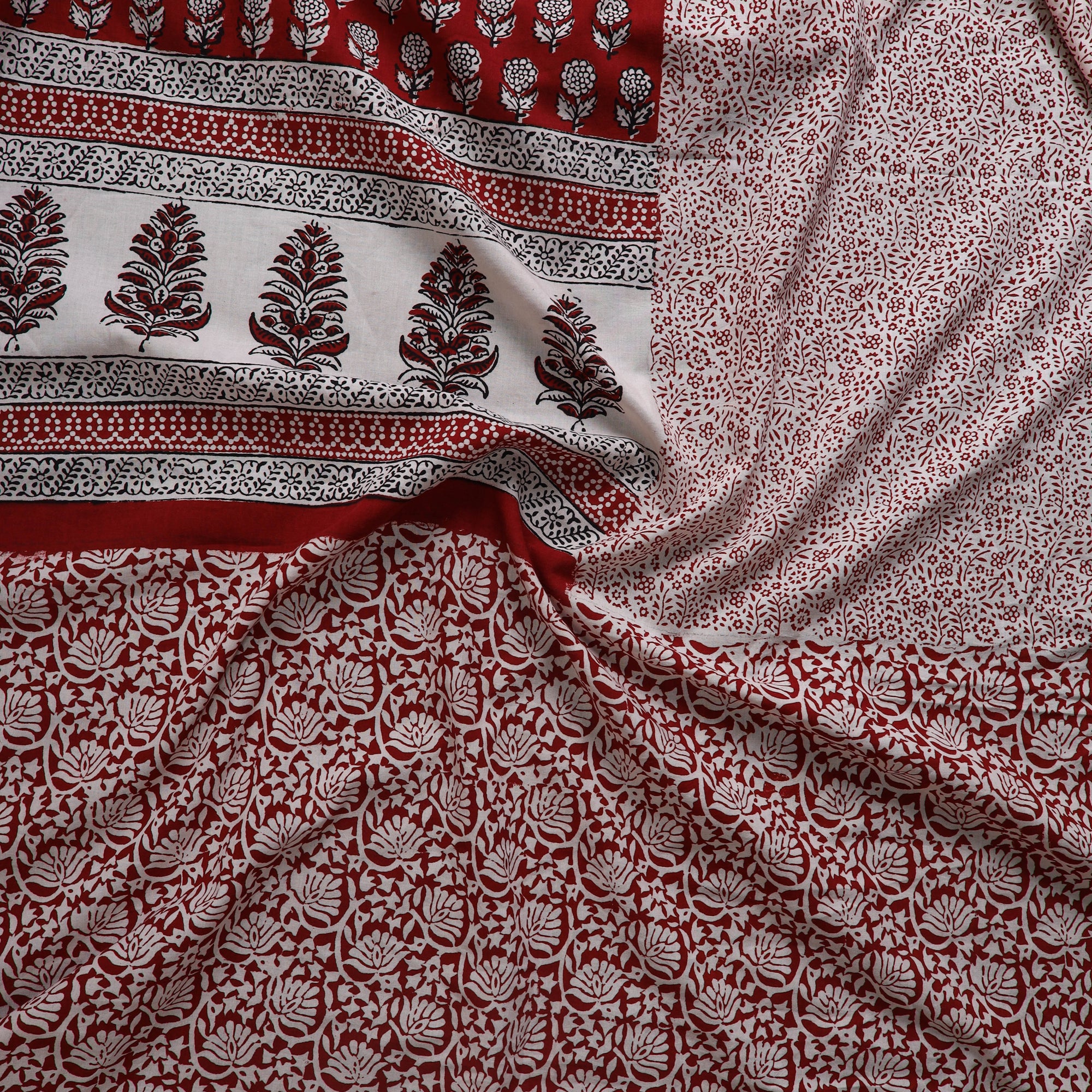 Bagh layouts are dramatic with the use of black and red alternately on a white background. Its production process is manually painstaking. Though the techniques and designs are age-old the prints retain their contemporary appeal.