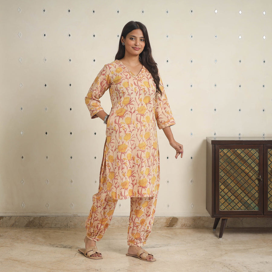 Stay stylish with this yellow cotton co-ord set featuring a fusion of bagru, ajrakh, and dabu hand block prints where age-old techniques meet modern-day comfort. Made from breathable, naturally dyed cotton, the top includes a handy side pocket, while the pants feature an elasticated waist for a relaxed fit. Perfect for brunch dates or festive outings, this set offers effortless charm for every occasion.