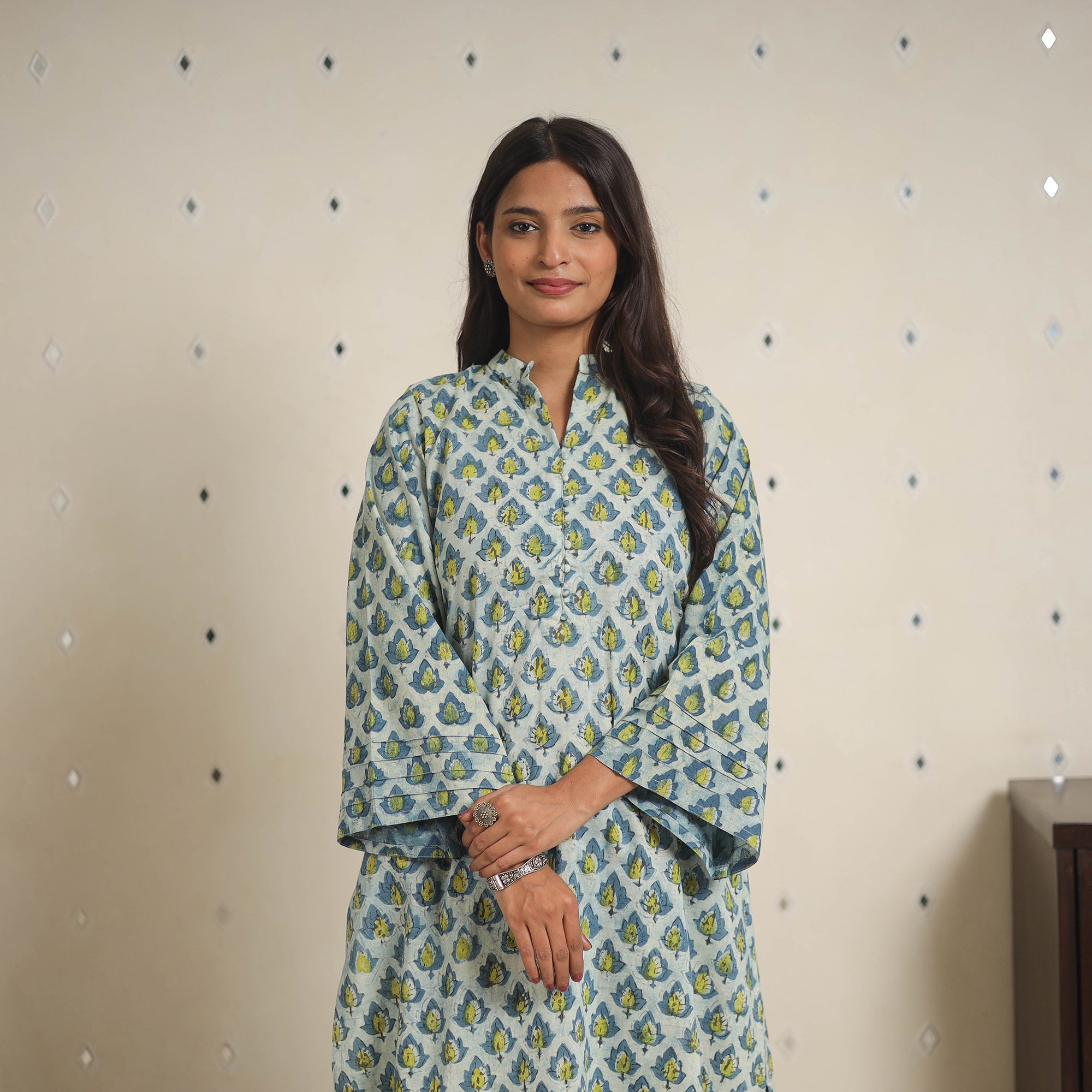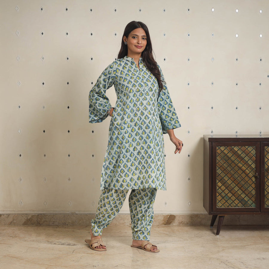 Stay stylish with this blue cotton bagru ajrakh dabu co-ord set, where age-old hand block printing techniques meet modern-day comfort. Made from breathable, naturally dyed cotton, the top includes a practical side pocket, while the salwar features its own pocket, an elasticated waistband, and a drawstring for a perfect fit. Whether it's brunch with friends or a cultural fest, this co-ord set brings effortless charm and heritage-inspired elegance to any occasion.