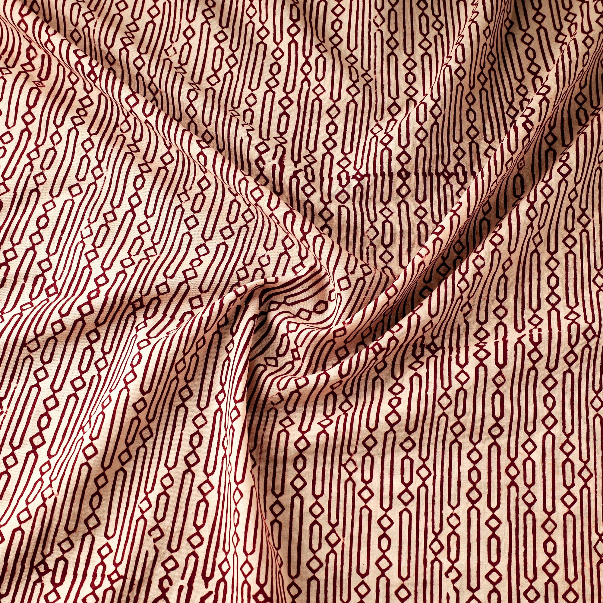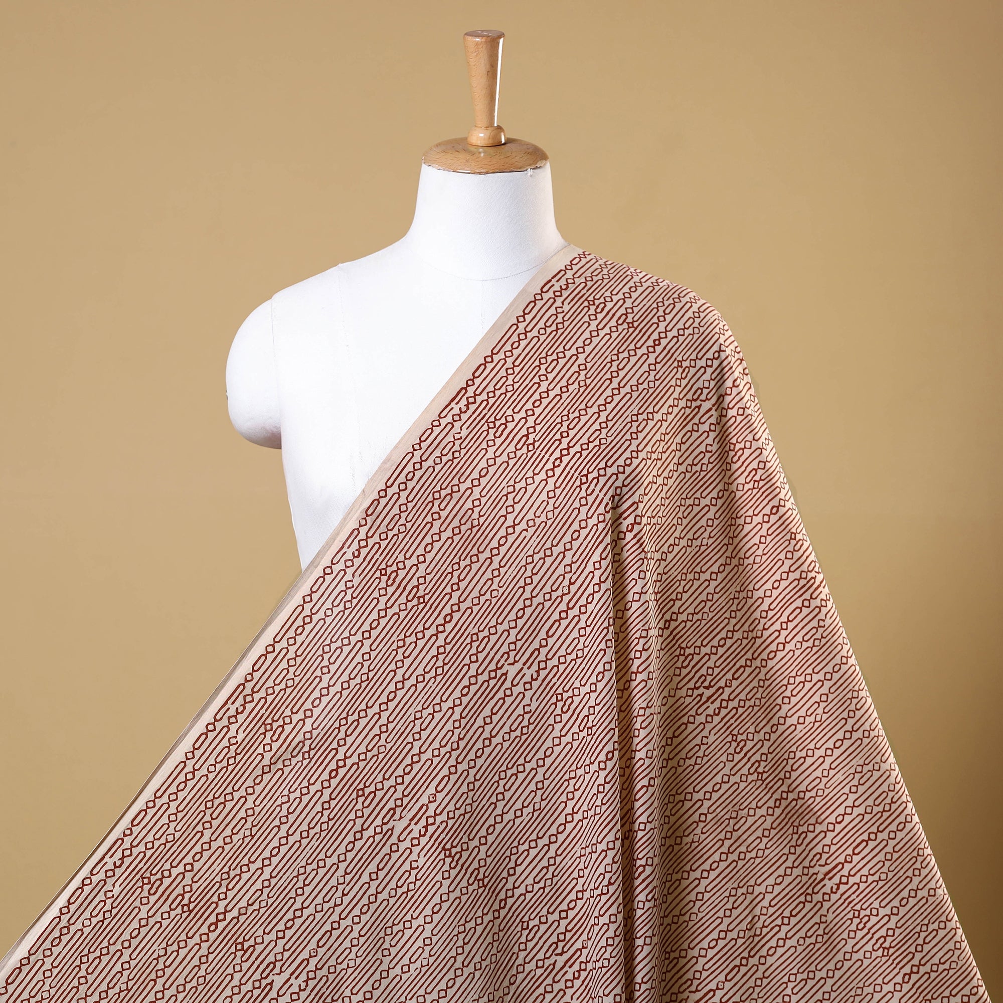 Experience the charm of beige block-printed cotton bagru fabric, made using natural dyes and the traditional mud-resist technique. Hand-printed with carved wooden blocks in Rajasthan, this fabric is ideal for clothing and home decor.
