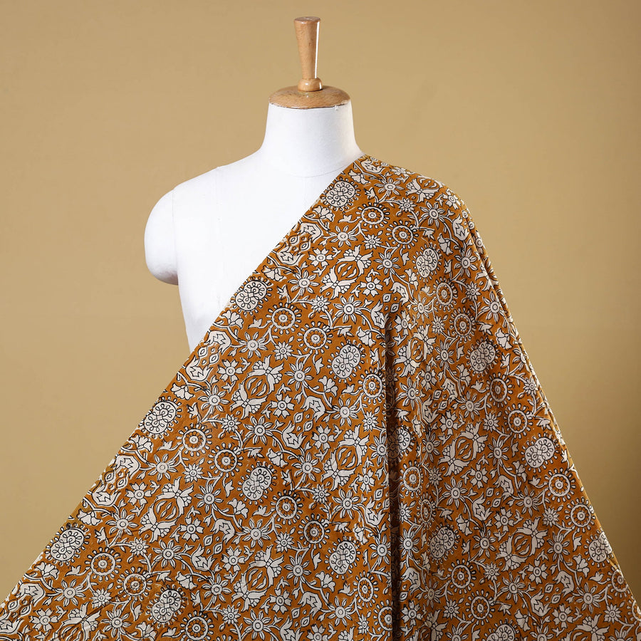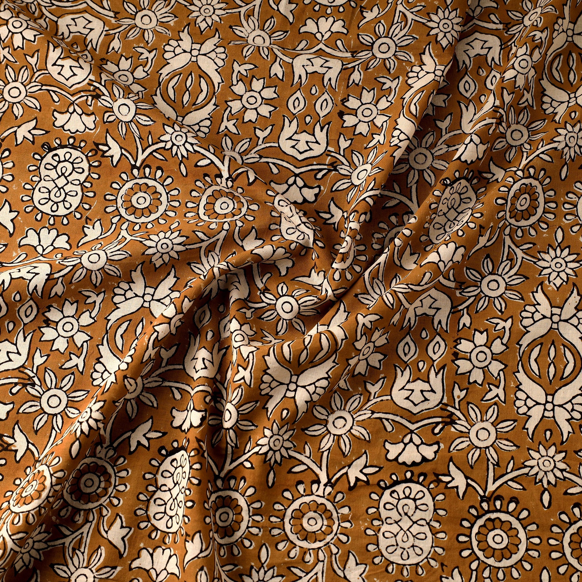 Experience the charm of brown block-printed cotton bagru fabric, made using natural dyes and the traditional mud-resist technique. Hand-printed with carved wooden blocks in Rajasthan, this fabric is ideal for clothing and home decor.