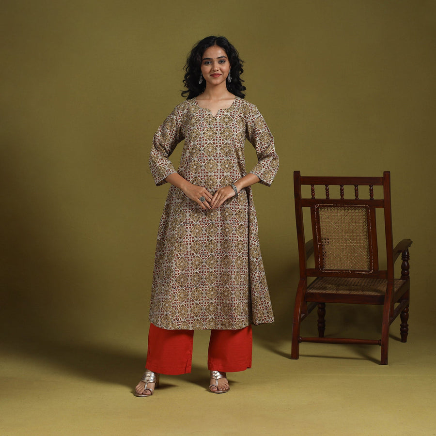A-line brown ajrakh kurta for women. Made from naturally dyed 100% pure cotton using the traditional Ajrakh block printing technique, it brings a perfect blend of heritage and everyday comfort. The breathable fabric keeps you at ease through the day, while the functional side pocket adds convenience. Ideal for casual outings, small celebrations.