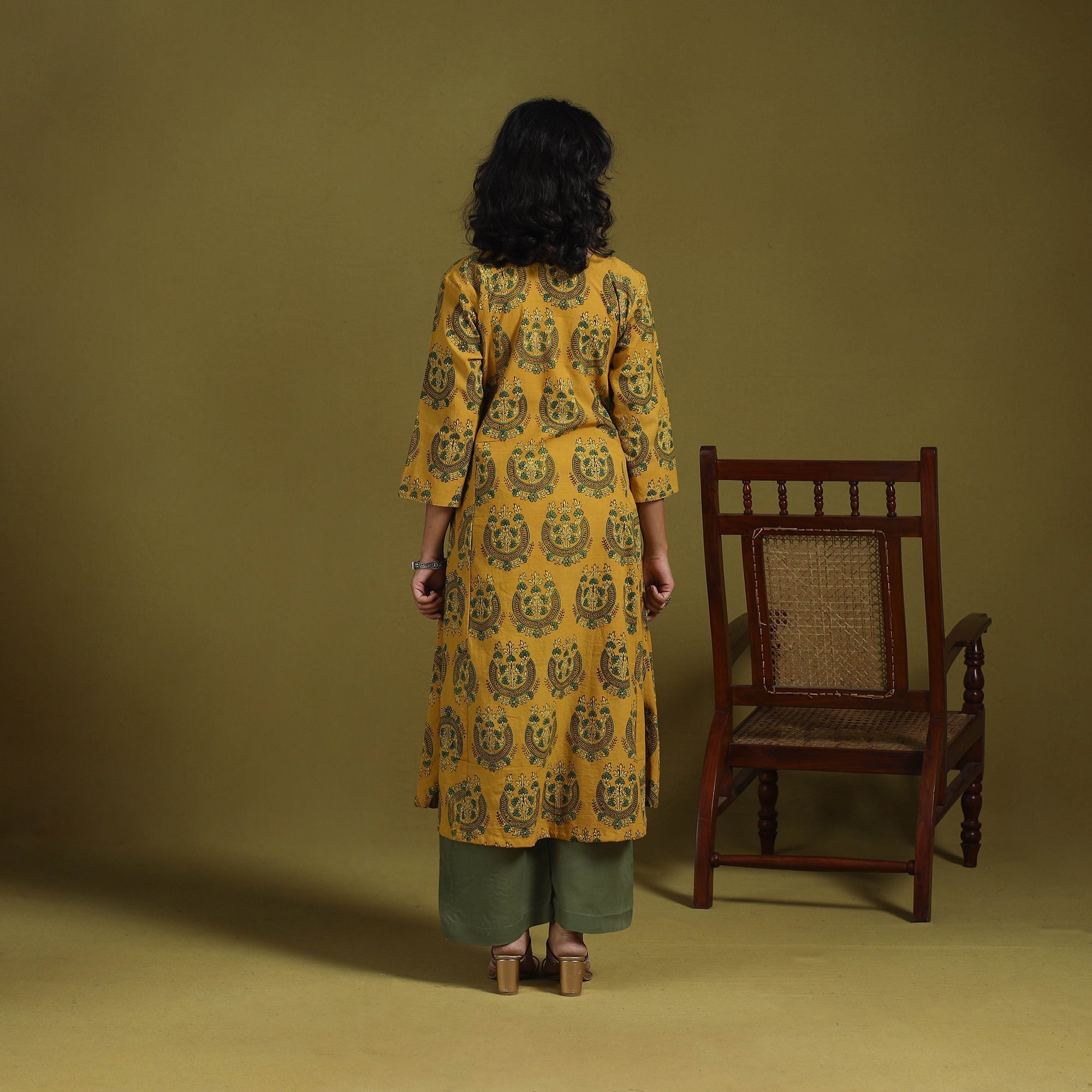 A-line yellow ajrakh kurta for women. Made from naturally dyed 100% pure cotton using the traditional Ajrakh block printing technique, it brings a perfect blend of heritage and everyday comfort. The breathable fabric keeps you at ease through the day, while the functional side pocket adds convenience. Ideal for casual outings, small celebrations.
