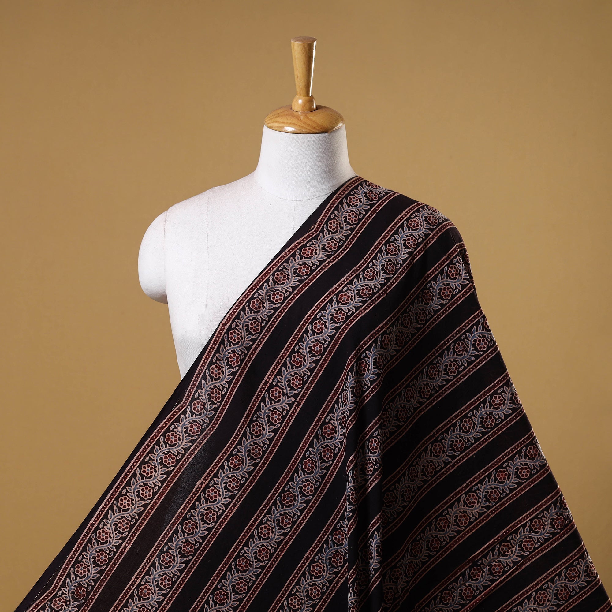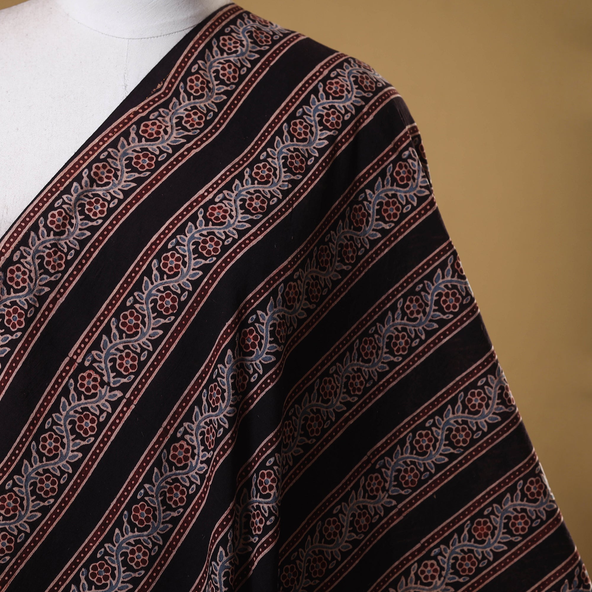 This black ajrakh print cotton fabric is hand block-printed in Kutch using natural dyes and age-old techniques passed down through generations. Crafted with precision, each motif reflects Gujarat’s rich textile heritage. Made of breathable cotton, it's ideal for creating kurtas, shirts, dresses, or even elegant home decor accents.