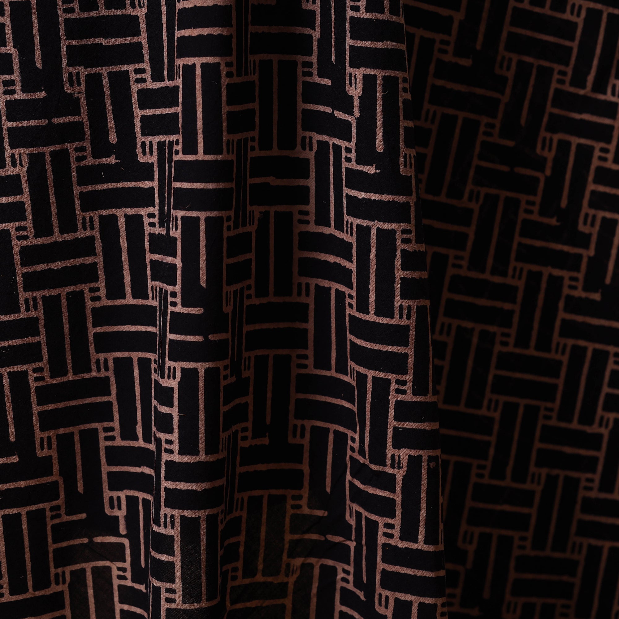 This black ajrakh print cotton fabric is hand block-printed in Kutch using natural dyes and age-old techniques passed down through generations. Crafted with precision, each motif reflects Gujarat’s rich textile heritage. Made of breathable cotton, it's ideal for creating kurtas, shirts, dresses, or even elegant home decor accents.