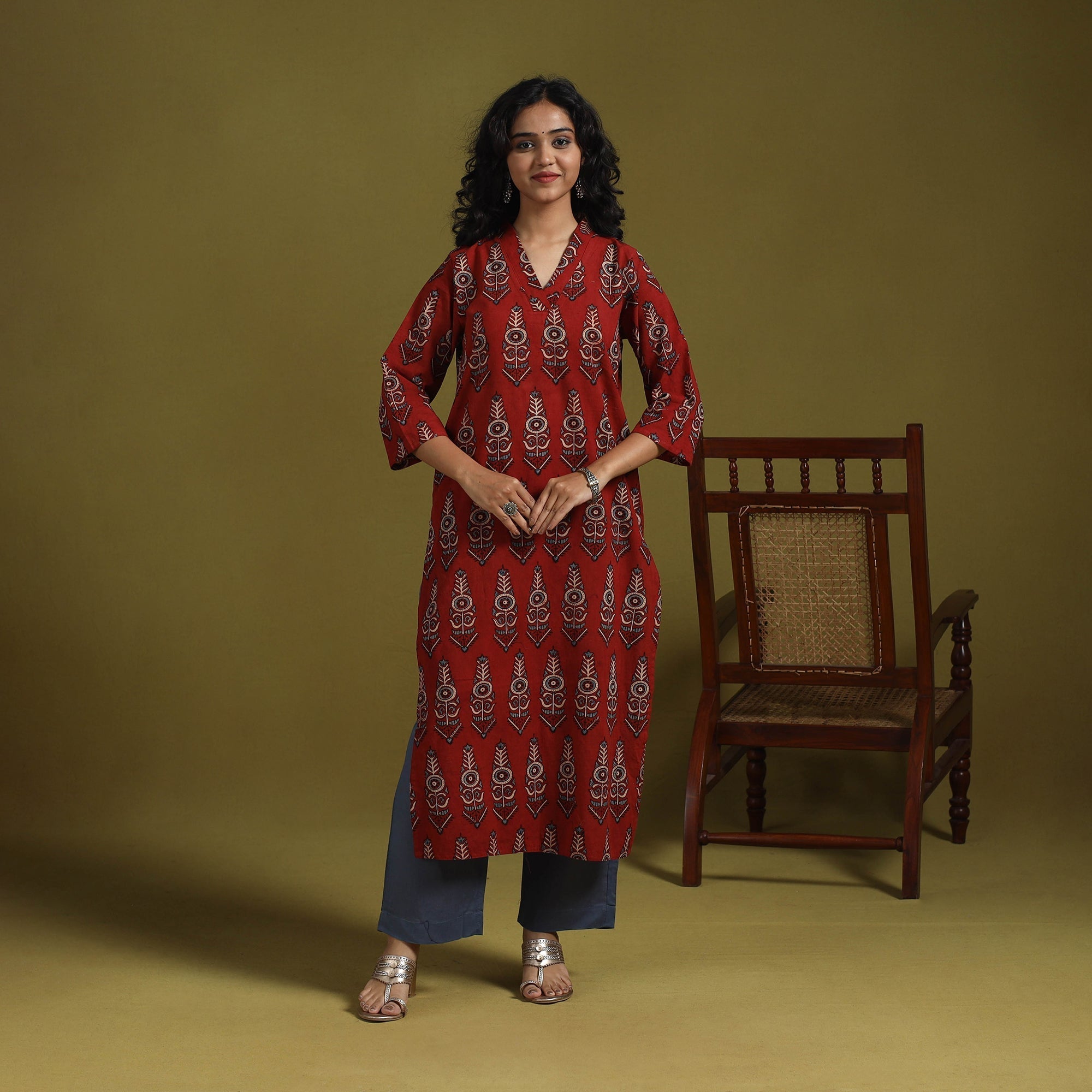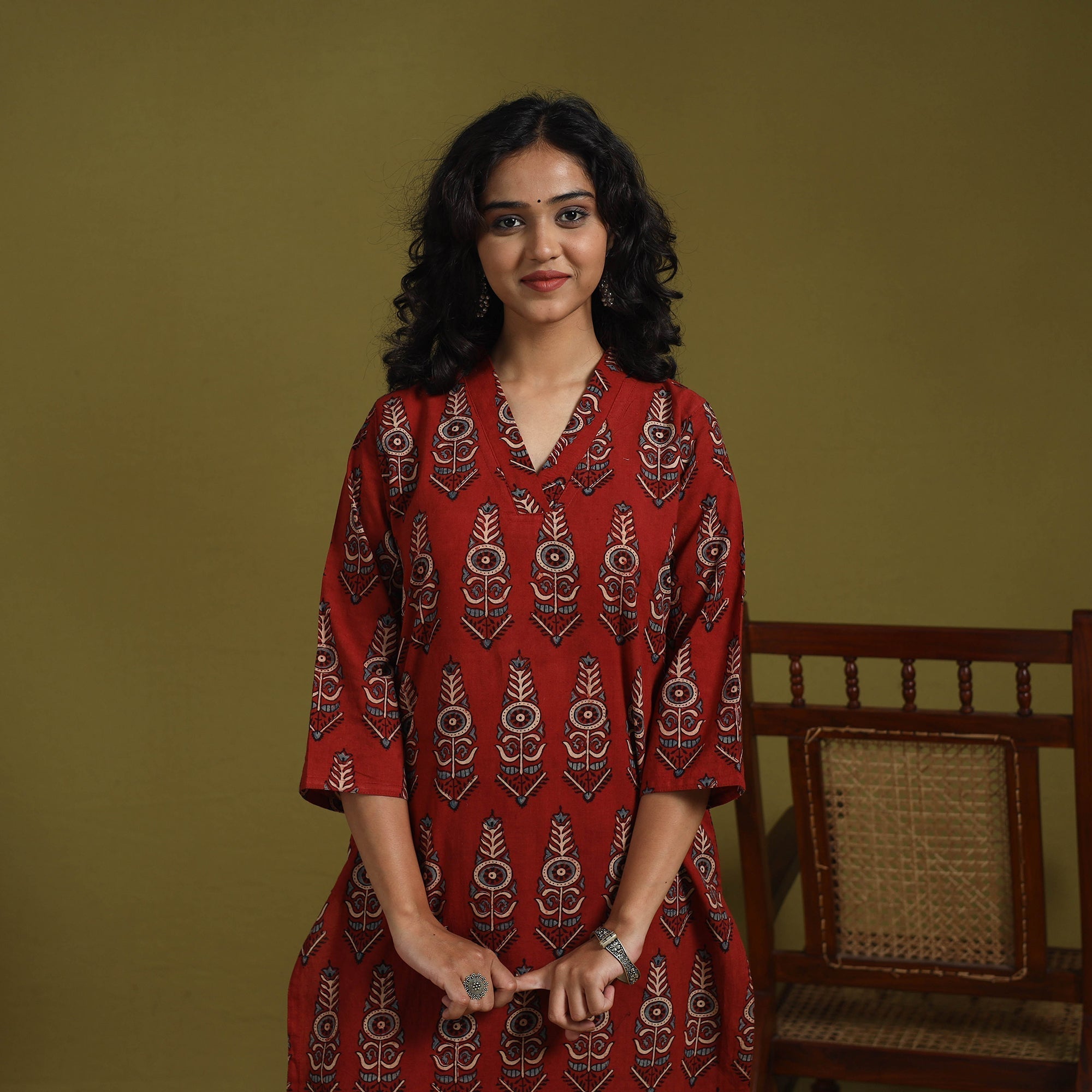 Straight red ajrakh kurta for women. Made from naturally dyed 100% pure cotton using the traditional Ajrakh block printing technique, it brings a perfect blend of heritage and everyday comfort. The breathable fabric keeps you at ease through the day, while the functional side pocket adds convenience. Ideal for casual outings, small celebrations.