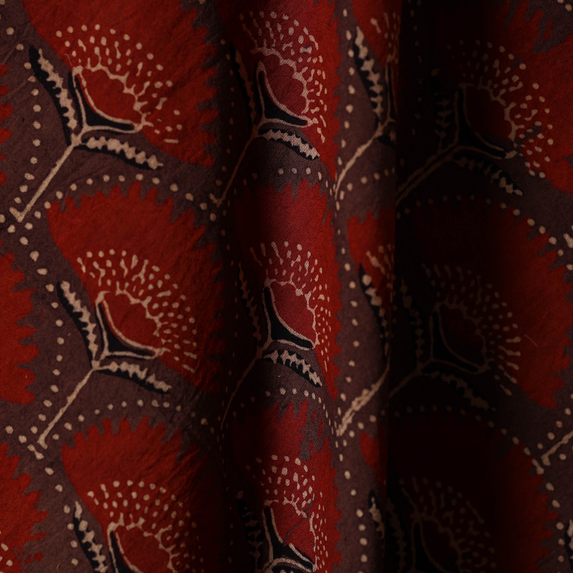 This red natural dyed cotton hand block ajrakh print fabric is carefully crafted by artisan Jabbar Khatri from Kutch, Gujarat. Created using traditional Ajrakh techniques and natural dyes, it beautifully showcases rich cultural artistry. Ideal for making outfits or home decor items.