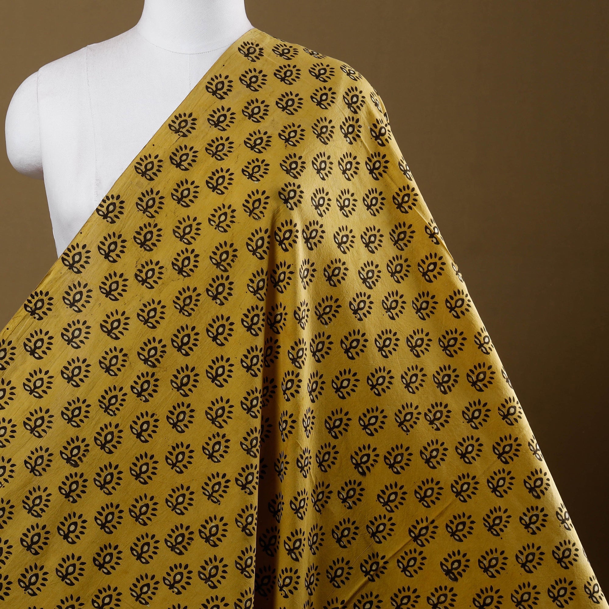 Yellow pipad block-printed cotton fabric by Chhipa Yasin Shahabuddin from Rajasthan. It is made using the traditional Pipad printing method, where artisans hand-carve wooden blocks and print each motif by pressing the block firmly onto the cotton surface. The design is built layer by layer, and the fabric is washed and dried after each stage. This method gives pipad prints their distinct look and makes the fabric suitable for anyone who prefers textiles created through practiced printing techniques.