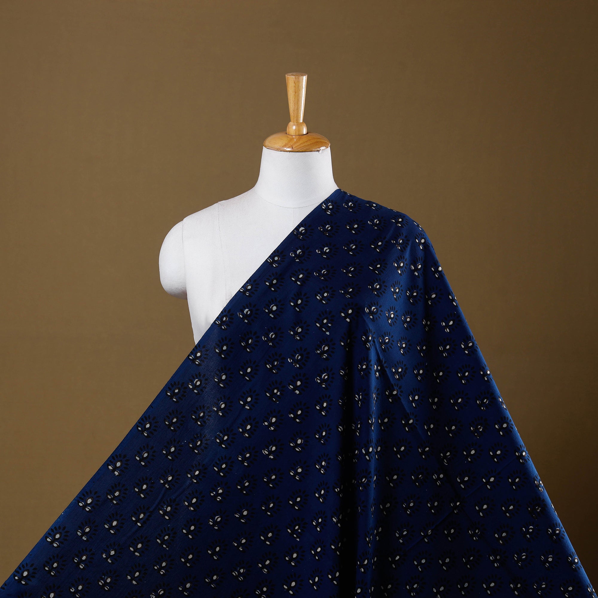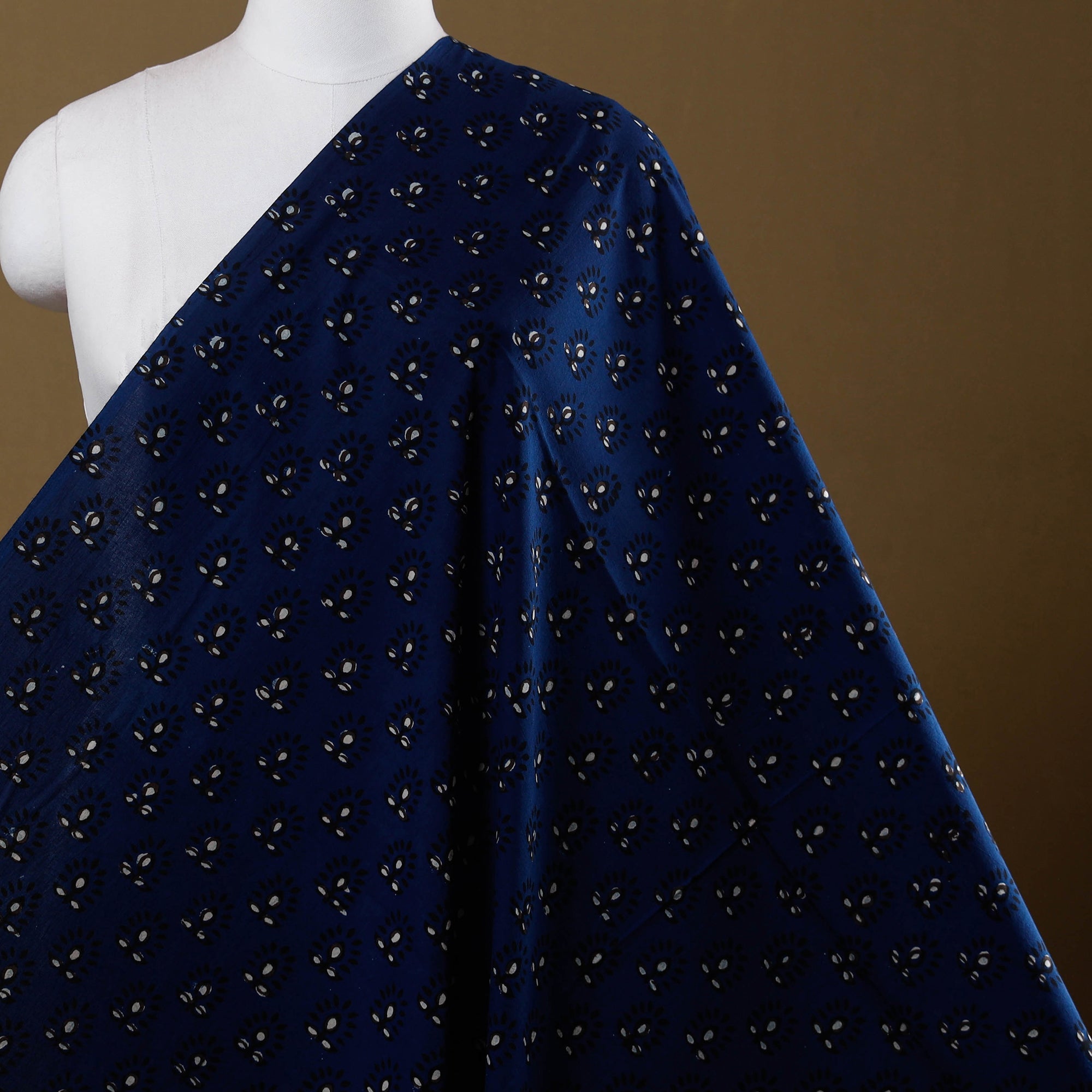 Blue pipad block-printed cotton fabric by Chhipa Yasin Shahabuddin from Rajasthan. It is made using the traditional Pipad printing method, where artisans hand-carve wooden blocks and print each motif by pressing the block firmly onto the cotton surface. The design is built layer by layer, and the fabric is washed and dried after each stage. This method gives pipad prints their distinct look and makes the fabric suitable for anyone who prefers textiles created through practiced printing techniques.