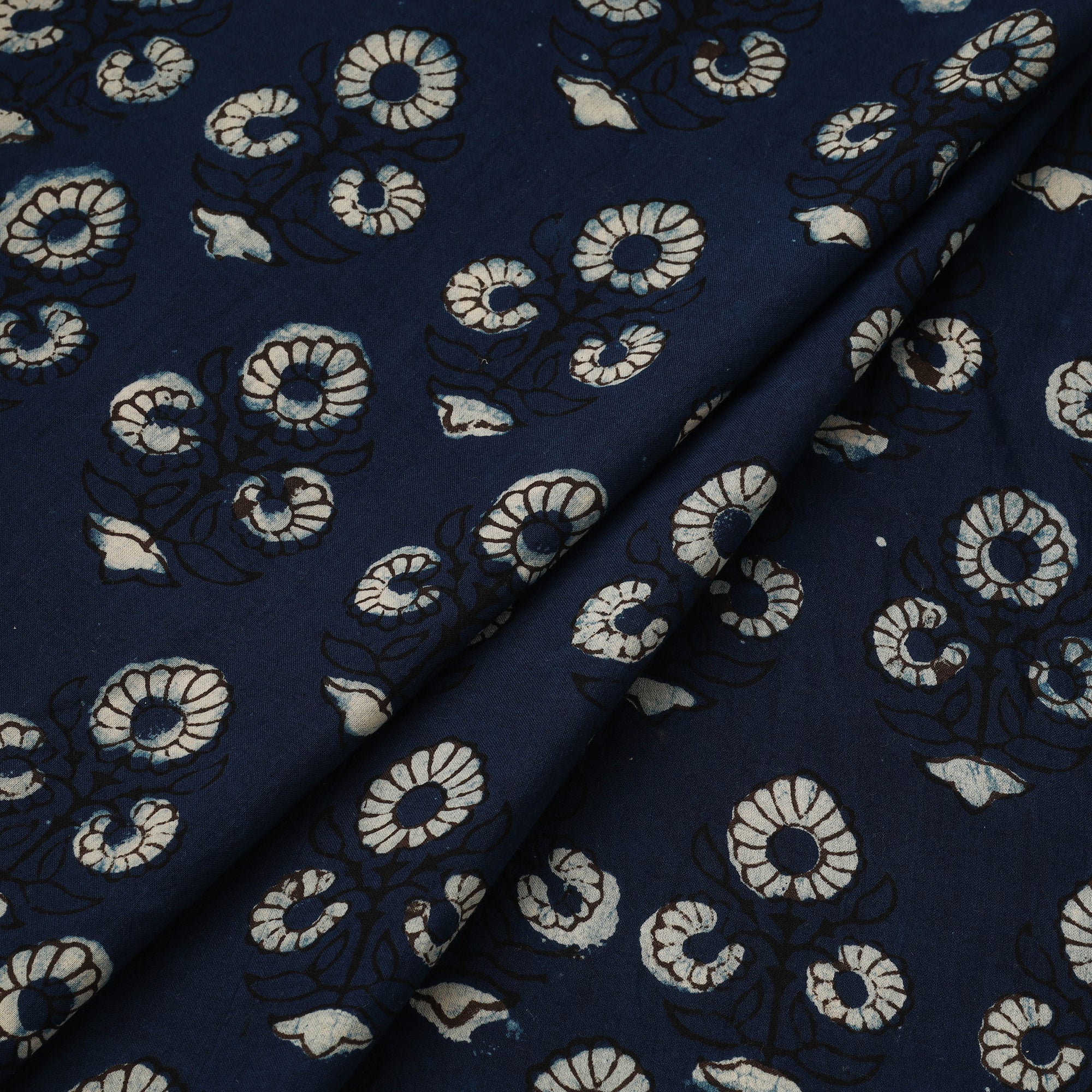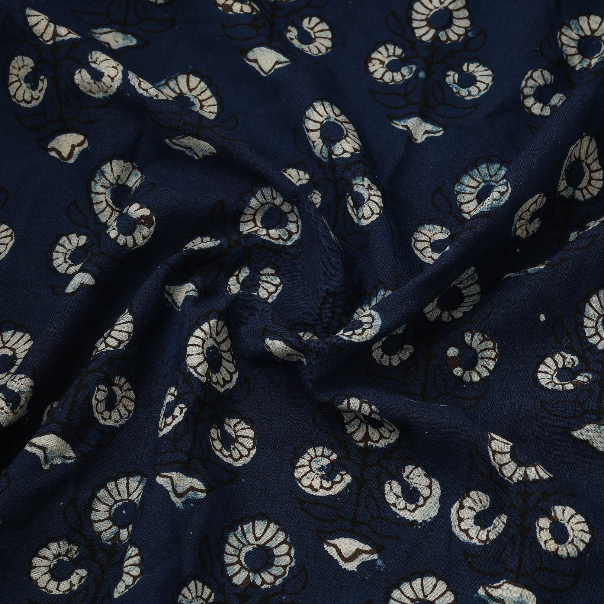 Blue pipad hand block print cotton fabric by Chhipa Yasin Shahabuddin from Rajasthan. Made using the traditional pipad block printing method where artisans hand-carve wooden blocks and print each motif by pressing the block firmly onto the cotton surface. This method gives fabric their distinct look and makes the fabric suitable for anyone who prefers textiles created through practiced printing techniques.