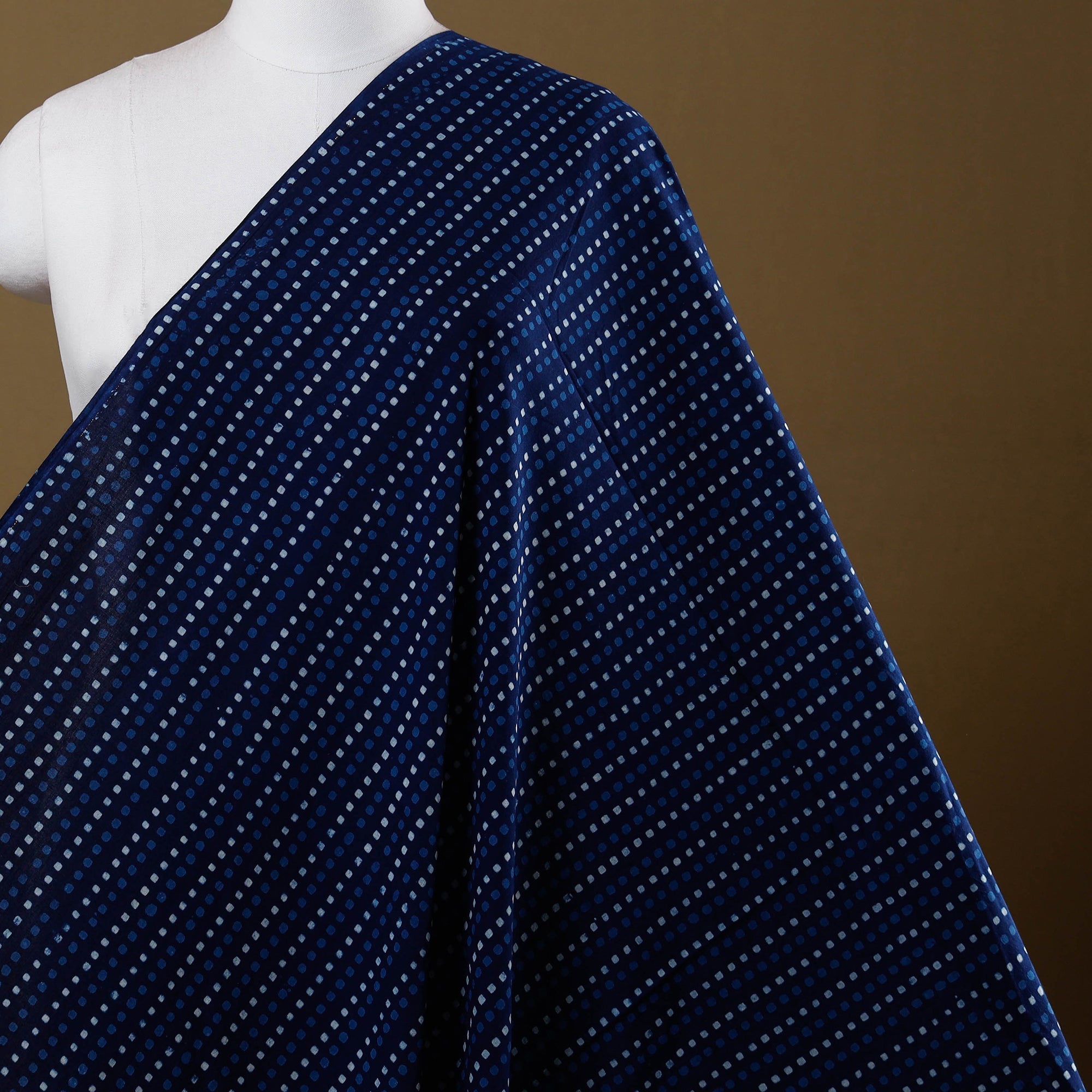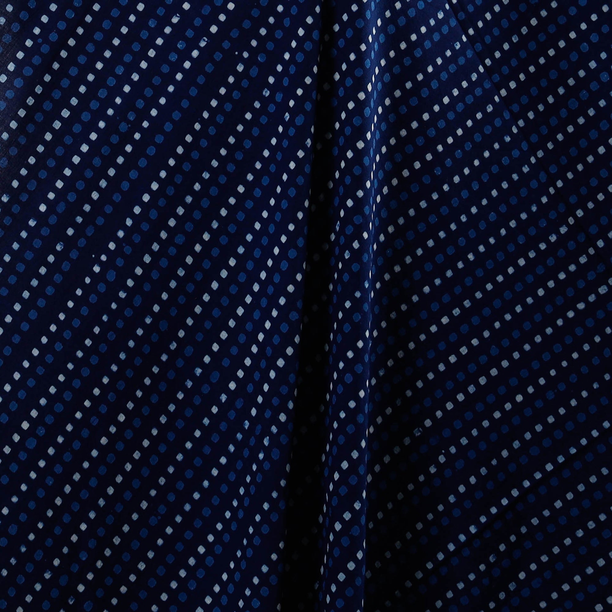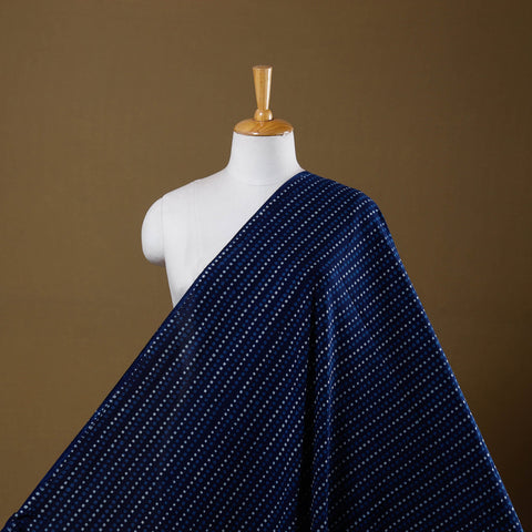 Blue pipad block-printed cotton fabric by Chhipa Yasin Shahabuddin from Rajasthan. It is made using the traditional Pipad printing method, where artisans hand-carve wooden blocks and print each motif by pressing the block firmly onto the cotton surface. The design is built layer by layer, and the fabric is washed and dried after each stage. This method gives pipad prints their distinct look and makes the fabric suitable for anyone who prefers textiles created through practiced printing techniques.