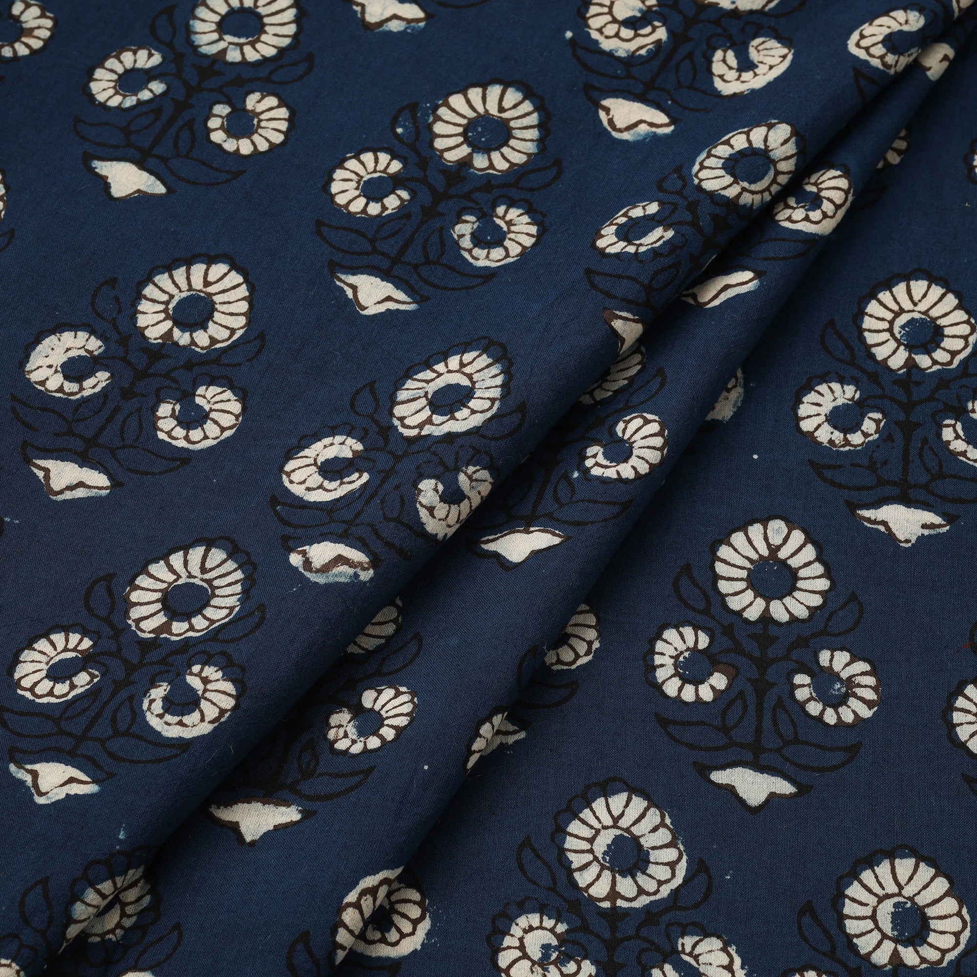 Blue pipad hand block print cotton fabric by Chhipa Yasin Shahabuddin from Rajasthan. Made using the traditional pipad block printing method where artisans hand-carve wooden blocks and print each motif by pressing the block firmly onto the cotton surface. This method gives fabric their distinct look and makes the fabric suitable for anyone who prefers textiles created through practiced printing techniques.