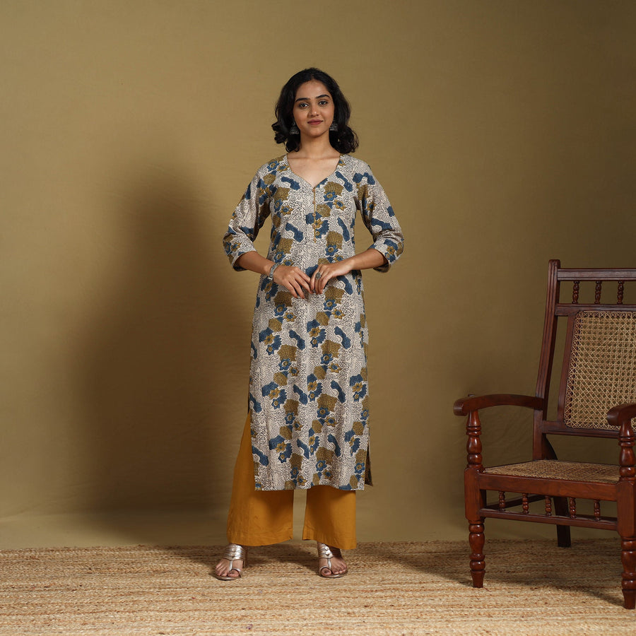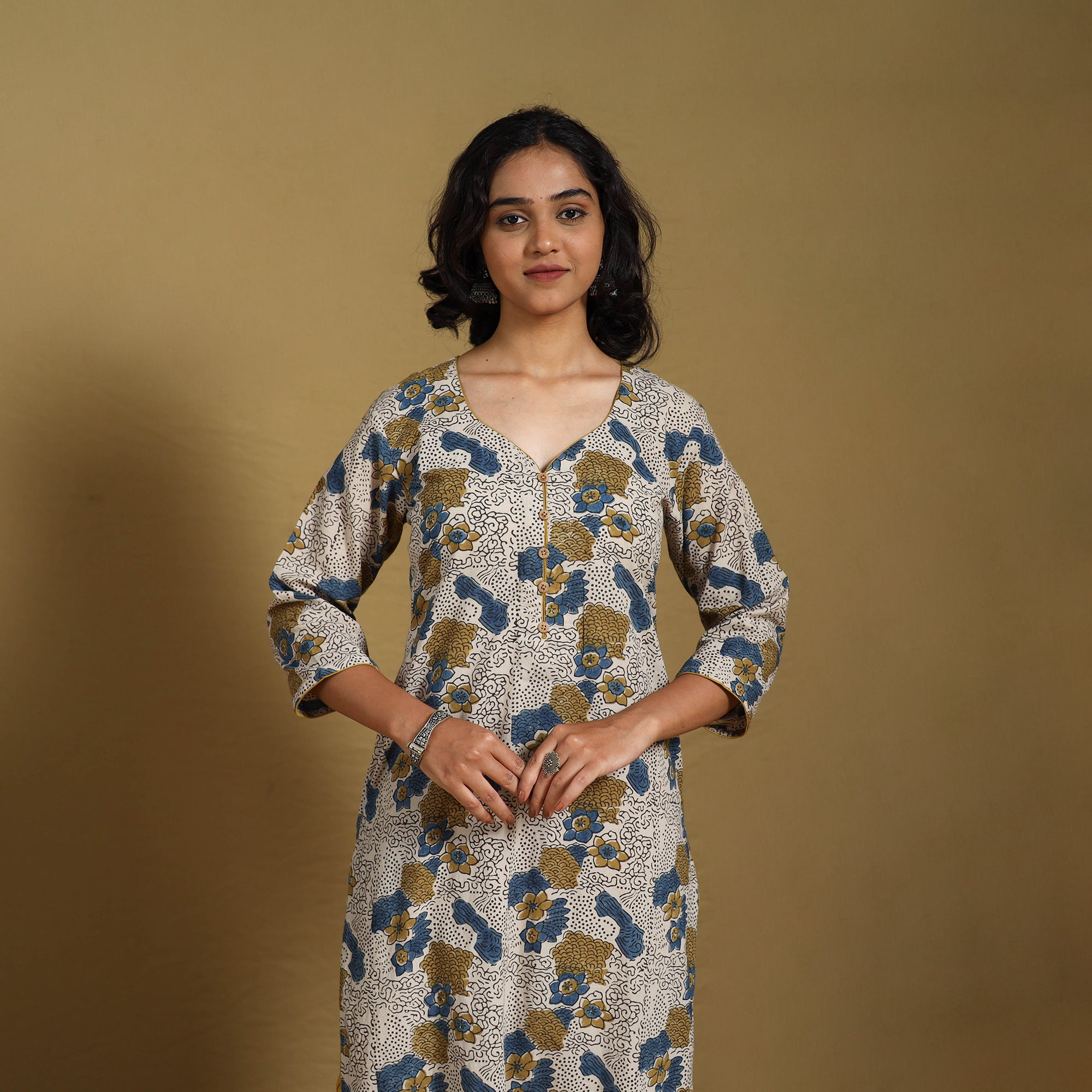 Look and feel beautiful in this beige straight ajrakh kurta. Crafted from naturally dyed fabric using the traditional ajrakh block printing method, it blends timeless design with everyday comfort. The breathable cotton fabric offers all-day ease, while a functional side pocket adds practicality, perfect for casual outings or festive gatherings.