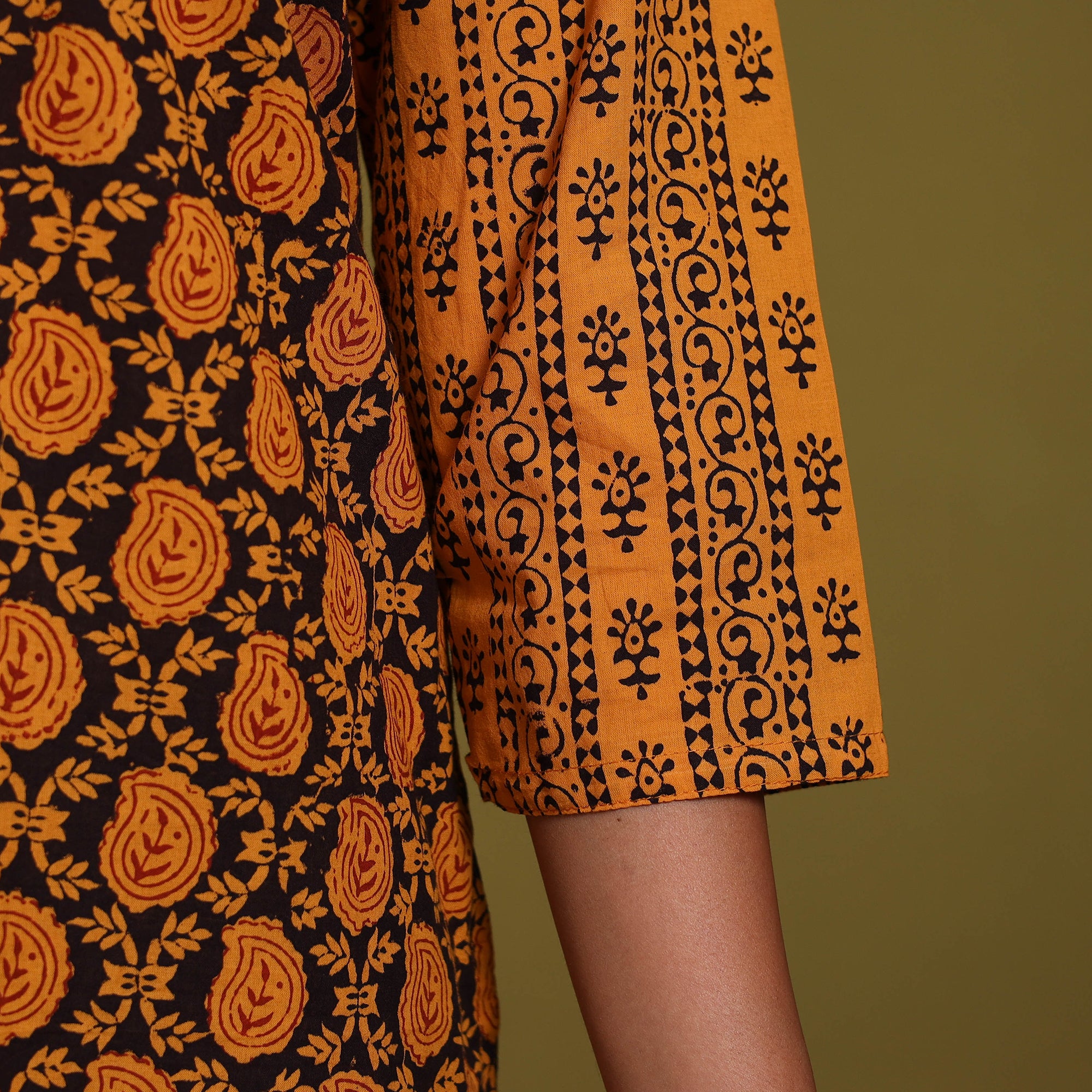 This orange bagh kurta is crafted using traditional block printing from Madhya Pradesh. Made from breathable cotton, it reflects centuries-old artistry where natural dyes merge with bold geometric patterns. With its easy fit and functional side pocket, it combines everyday comfort with cultural heritage. Ideal for both relaxed outings and festive occasions.