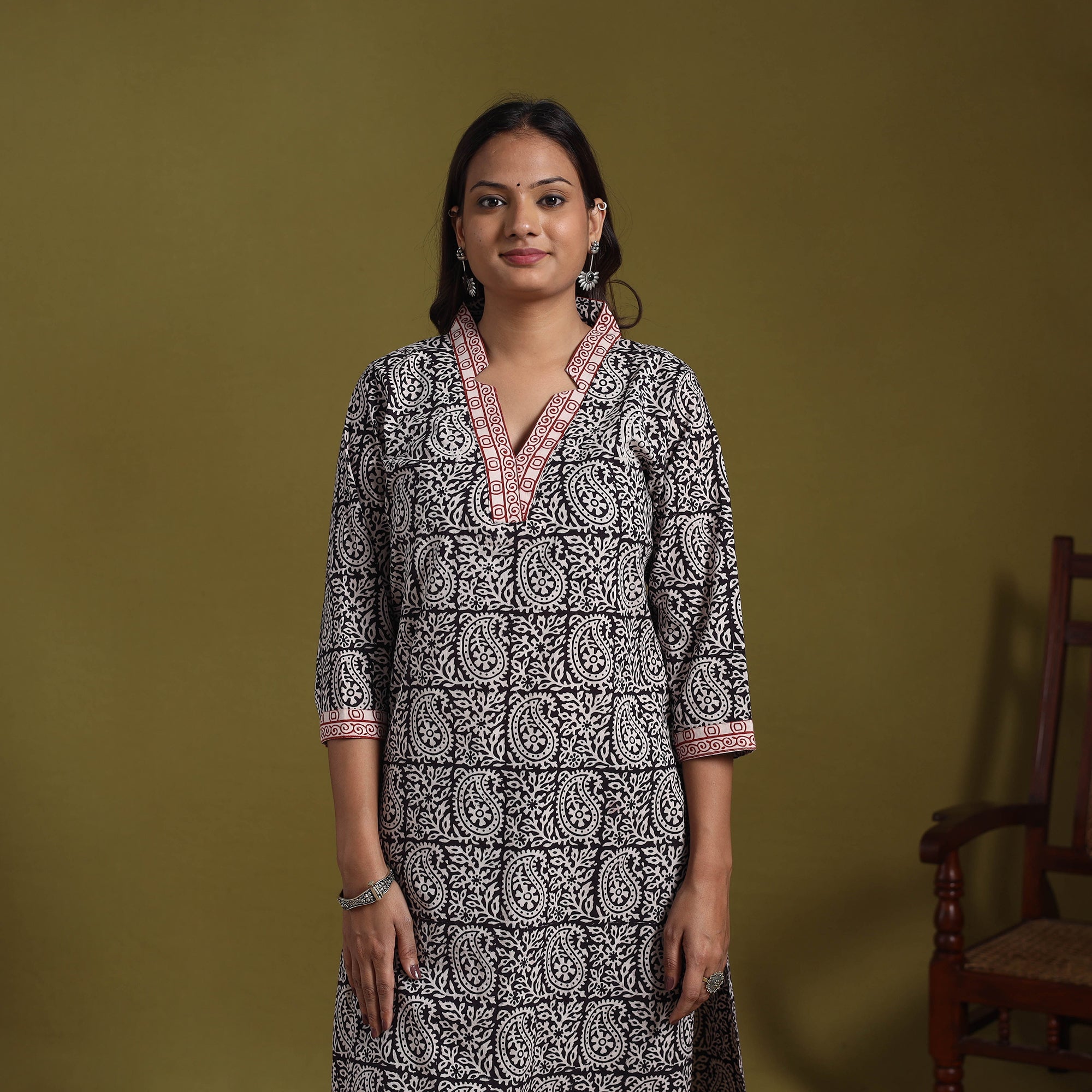 This black straight bagh kurta is crafted using traditional block printing from Madhya Pradesh. Made from breathable cotton, it reflects centuries-old artistry where natural dyes merge with bold geometric patterns. Designed with a functional side pocket, it’s ideal for pairing with jeans, palazzos, or churidars for casual or festive looks.