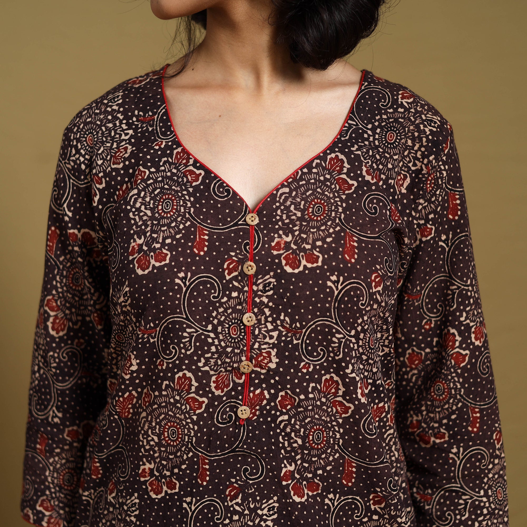 Look and feel beautiful in this brown straight ajrakh kurta. Crafted from naturally dyed fabric using the traditional ajrakh block printing method, it blends timeless design with everyday comfort. The breathable cotton fabric offers all-day ease, while a functional side pocket adds practicality, perfect for casual outings or festive gatherings.
