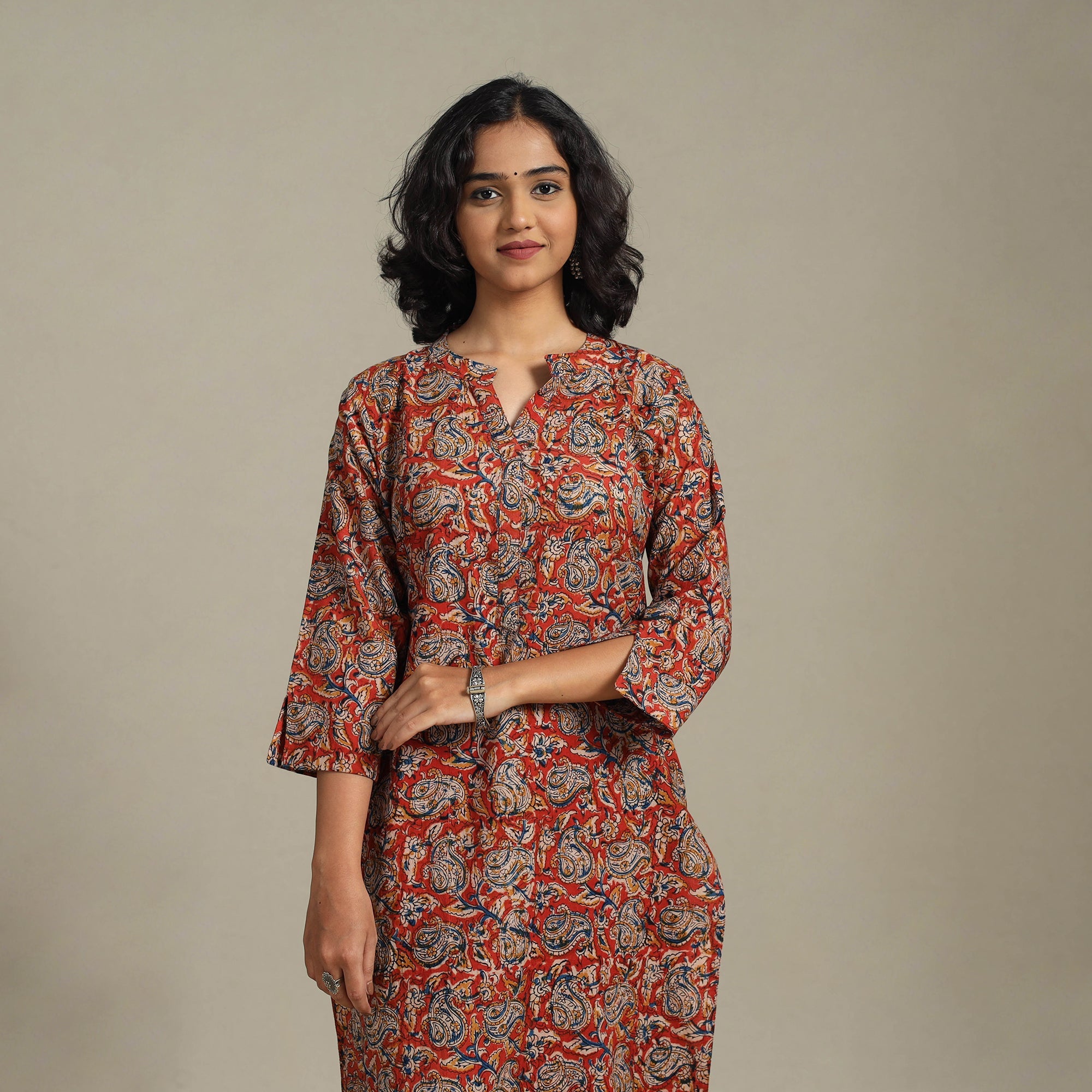 This red cotton straight kurta features pedana kalamkari block printing, using traditional wooden blocks and natural dyes. The intricate motifs echo generations of artistry. Designed in a relaxed fit with a functional side pocket, it's ideal for everyday ease or festive moments. A timeless piece that brings heritage craft into your modern wardrobe with effortless grace.