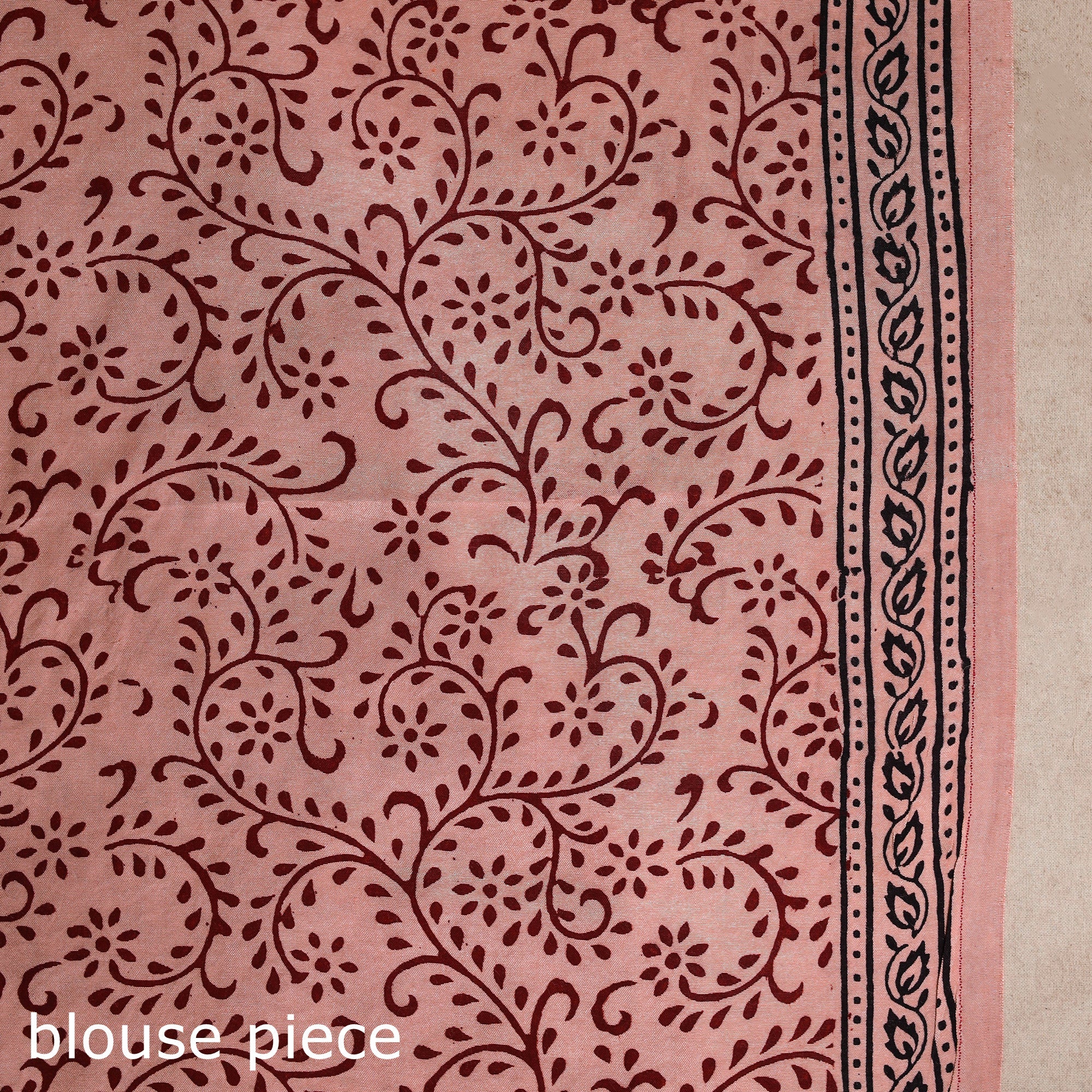Hand block-printed peach bagh dola silk saree. Made by skilled artisans, this saree features intricate patterns and rich colours created using natural dyes. Each piece reflects the traditional Bagh printing style, a craft that originates from the Dhar district of Madhya Pradesh. Its elegant appearance and handcrafted charm make it a perfect choice for festive occasions, everyday wear, or even as a thoughtful gift.