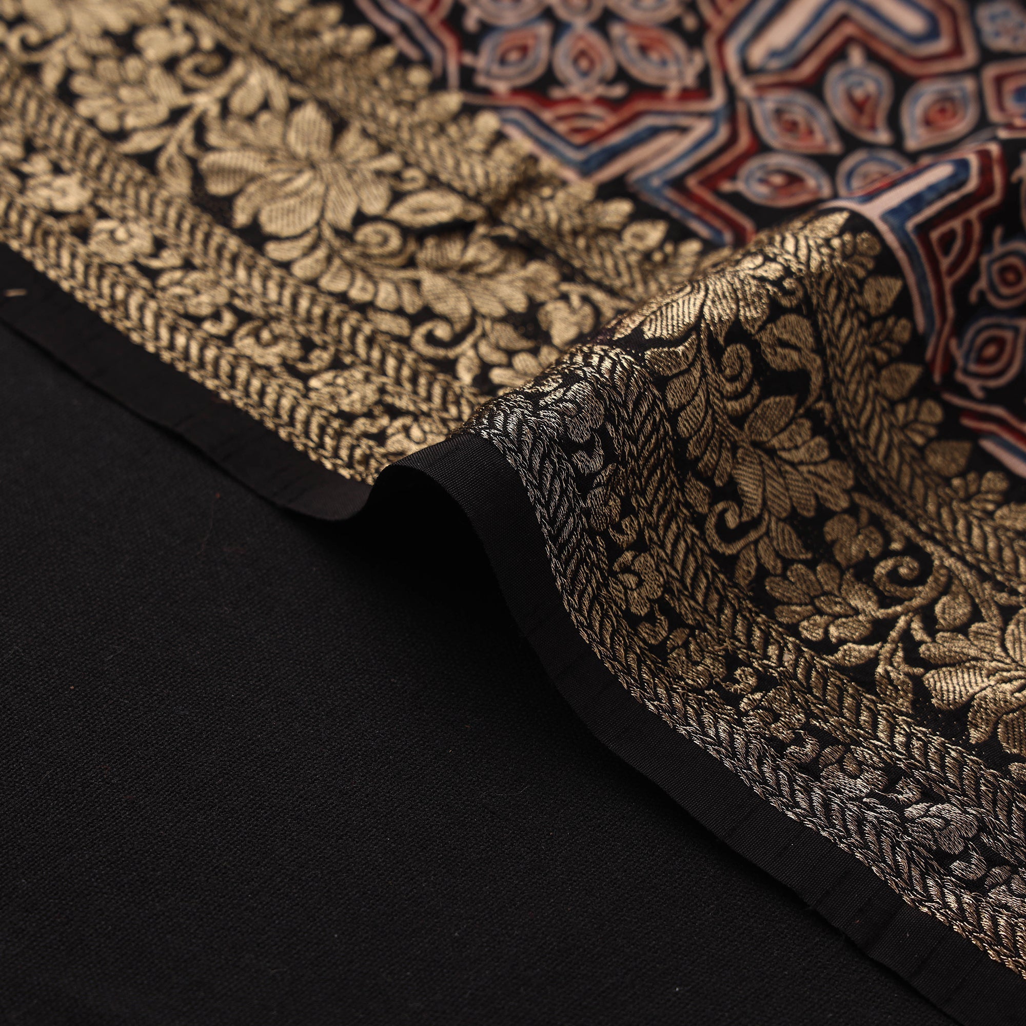 Black ajrakh fabric is hand block printed using traditional techniques and natural dyes from Kutch, showcasing Gujarat’s textile heritage through detailed patterns and rich tones. Crafted on dola silk cotton, it offers a smooth drape and comfortable wear. The added zari border gives it an elegant finish, making it ideal for kurtas, shirts, dresses or stylish home decor pieces.
