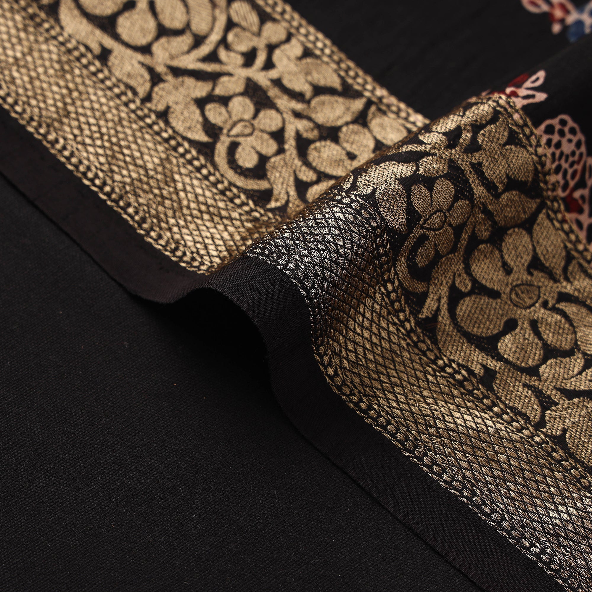 Black ajrakh fabric is hand block printed using traditional techniques and natural dyes from Kutch, showcasing Gujarat’s textile heritage through detailed patterns and rich tones. Crafted on dola silk cotton, it offers a smooth drape and comfortable wear. The added zari border gives it an elegant finish, making it ideal for kurtas, shirts, dresses or stylish home decor pieces.
